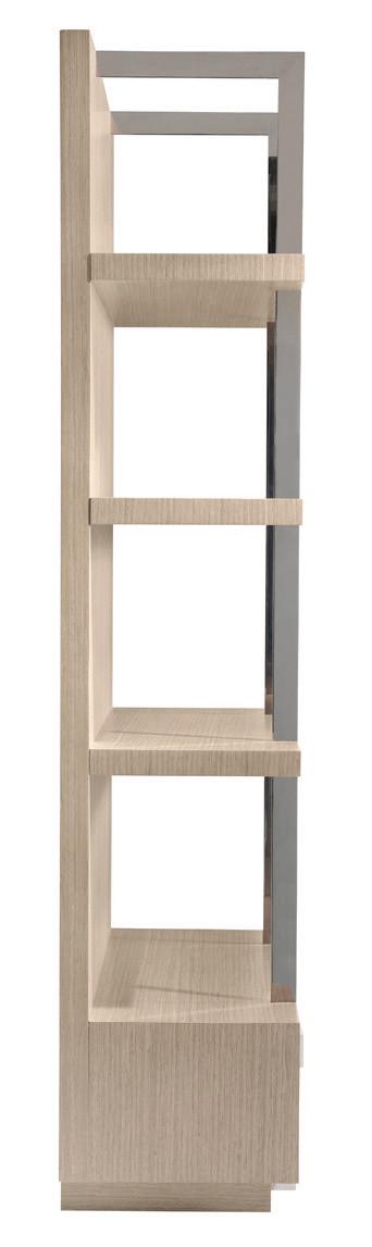 Sahara finish on veneered open front. Back panel, three fixed shelves and one fixed shelf surface with drawer at bottom. Two Polished Stainless Steel supports on front. Plinth base. Anti-tip kit.