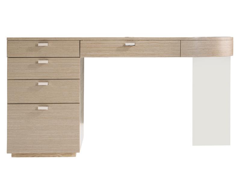 Engineered veneers in Sahara finish. Grommet hole with cover in Shiny Chrome finish on desk top. Power strip behind top left drawer with two USB ports and two outlets. Bottom file drawer accommodates letter or legal files. Center fully extendable drawer with drop front. Polished Stainless Steel support panel on right end of desk and visible on desk top.