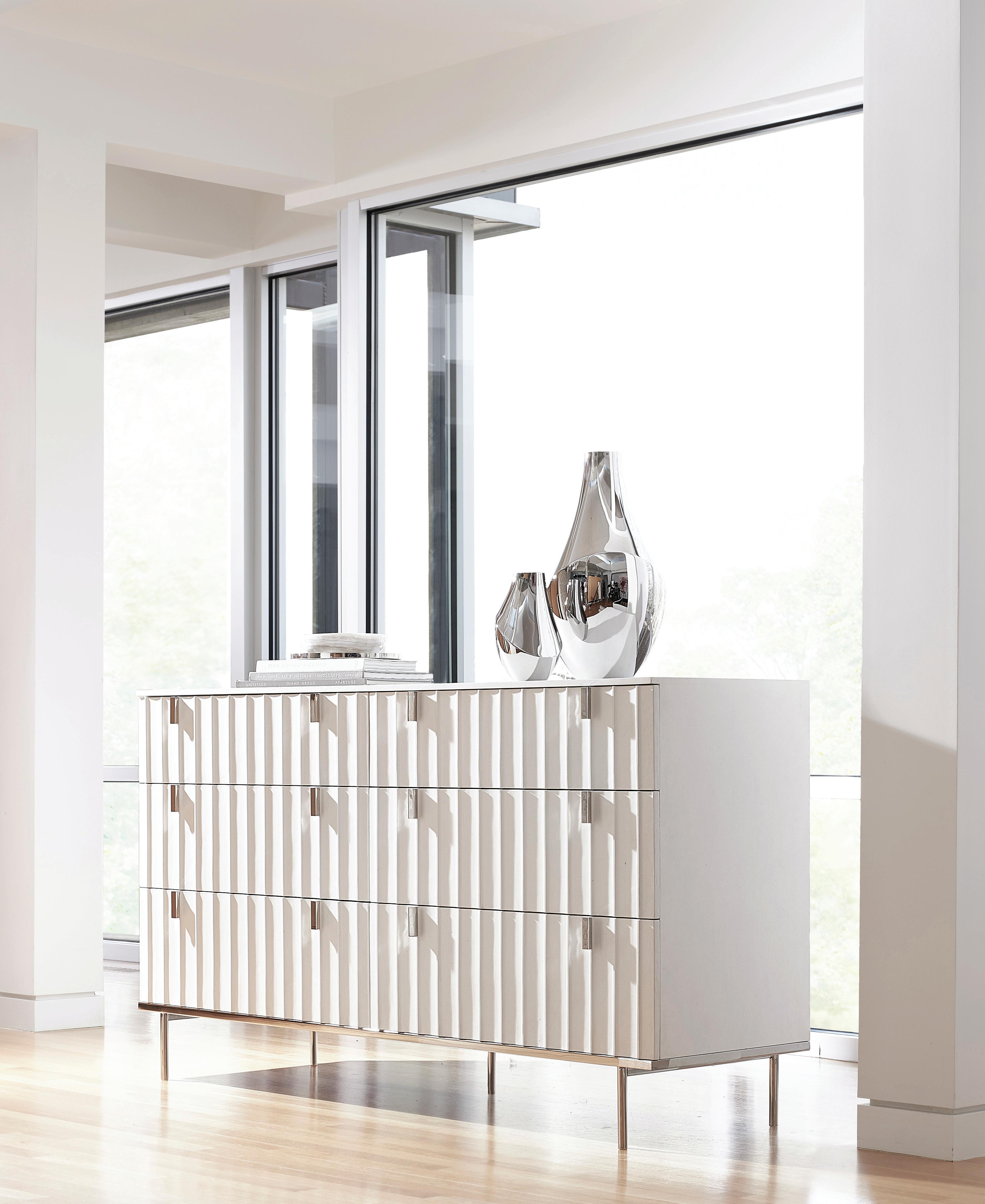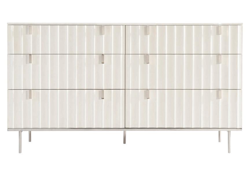 Adobe faux stone finish. Six soft-close drawers with fluted cast resin drawer fronts. Polished Stainless Steel base. Wood center support leg. Anti-tip kit. Note: Not designed to support TV and/or other media.