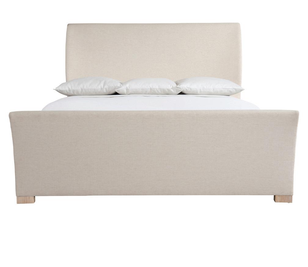 Curved upholstered sleigh headboard and footboard with exposed wood feet in Sahara finish. Upholstered side rails. Five wood slats with adjustable double center support. Headboard cannot be used alone. Must be ordered with footboard/side rails.