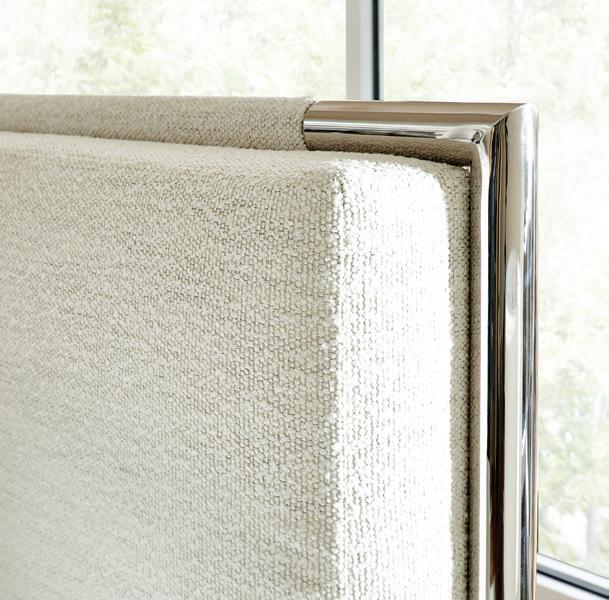 Polished Stainless Steel frame with upholstered headboard panel with center seam and two fabric sleeves that wrap over the top metal rail. Upholstered side rails. Upholstered footboard panel with stainless steel posts. Five wood slats with adjustable double support. Headboard cannot be used alone. Must be ordered with footboard/side rails.