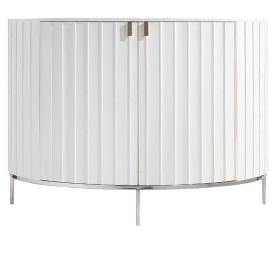 Adobe faux stone finish on demilune shaped chest with two doors with concealed hinges. Fluted design on door fronts. Behind doors is one fixed shelf. Interior painted to match exterior. Polished Stainless Steel base. Anti-tip kit.