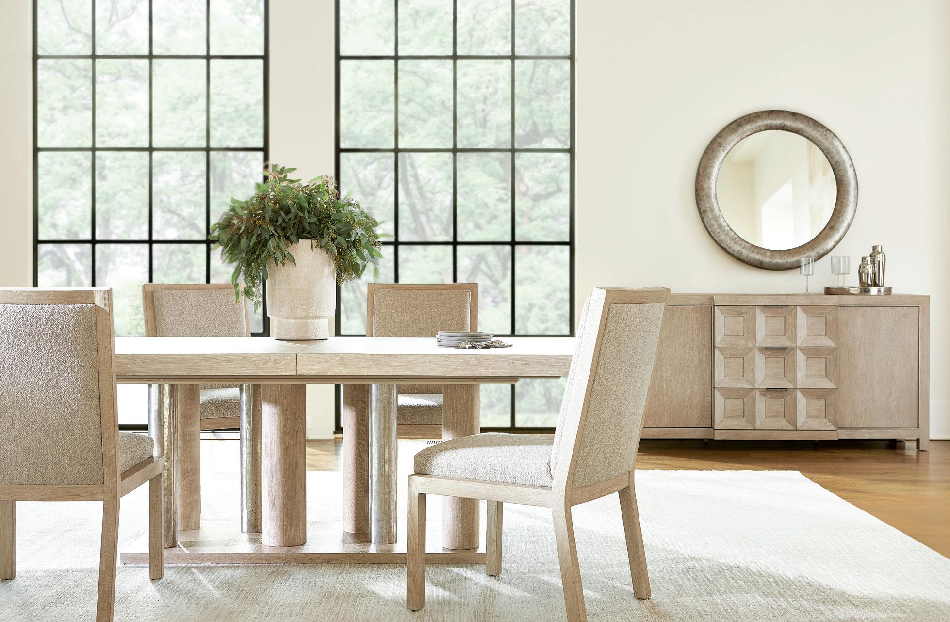 PAGES 6-7: 324221B Round Dining Table, 324546B Arm Chairs (Fabric B104), 324131B Sideboard, 324333 Mirror