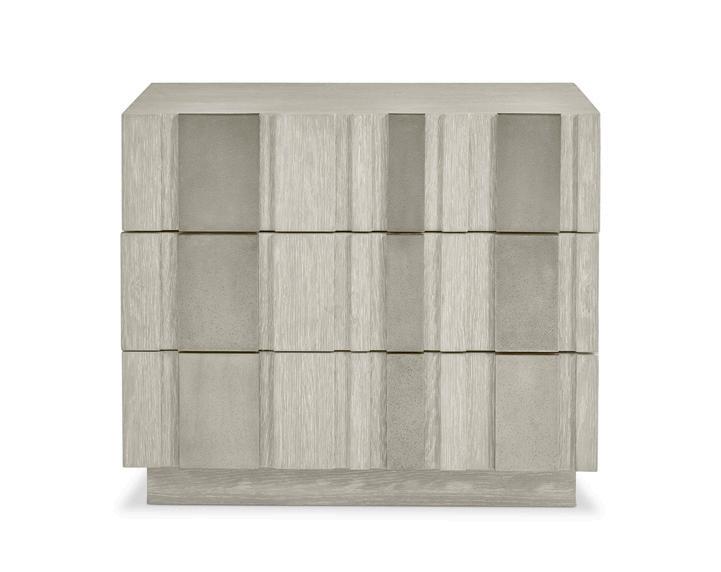 Wirebrushed oak in Larza finish. Three push-to-open drawers with raised panel fronts and random sandblasted aluminum overlays in Satin Nickel finish. Plinth base. Two-port A+C USB charging unit. Anti-tip kit. Adjustable glides.