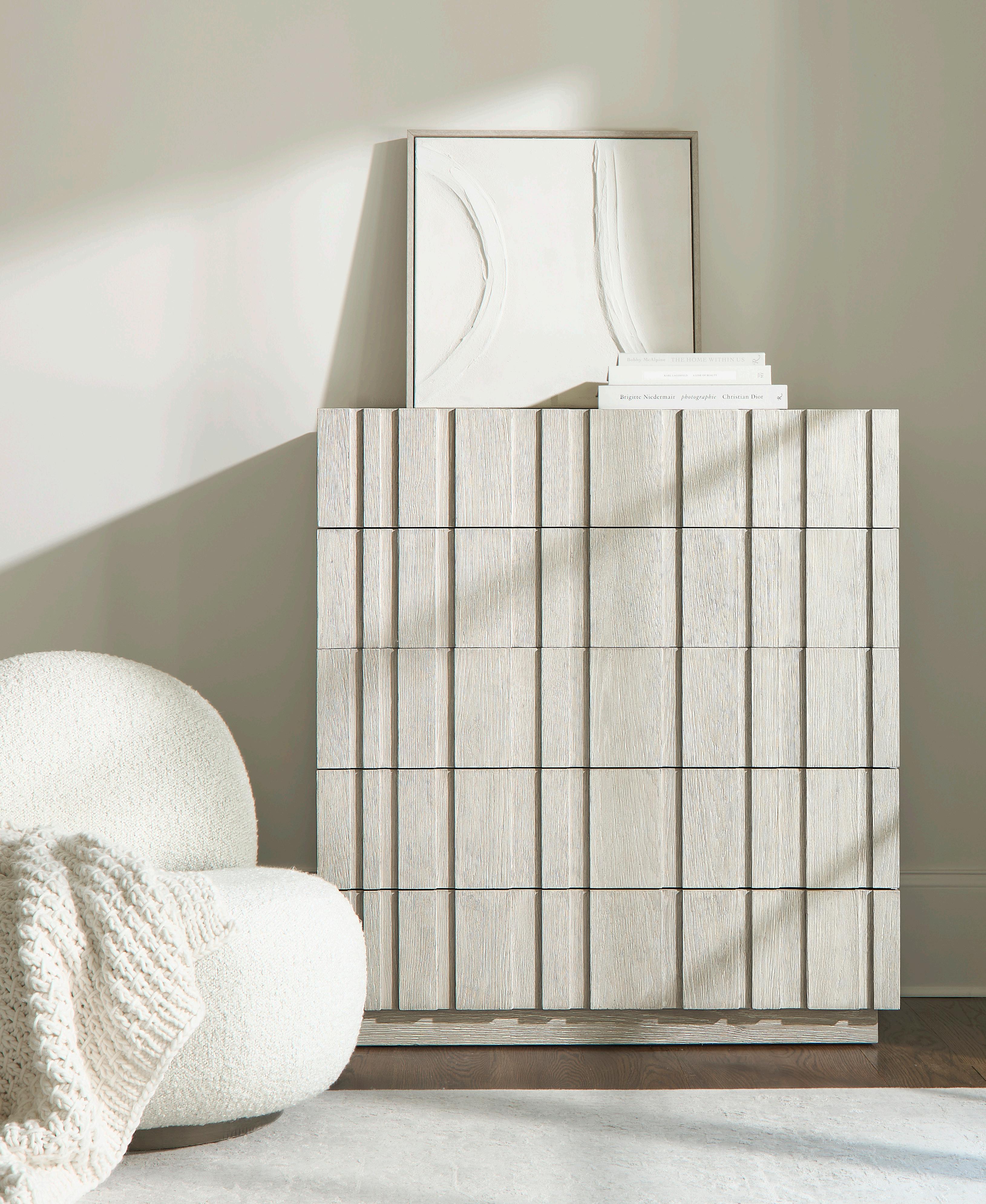 Refined and architectural, Tempo builds on a unique expression of proportion, rhythm and dimension. Bands of textured metal provide a soft contrast to the warm grey finish, adding structure and shine. Vertical panels create a visual cadence of shadow and light. Materials, form and pattern are combined with flawless balance, composing moments of drama. Linear open frames define space and scale, blending the depth of a cerused wood grain with clean lines and unadorned surfaces. The collection displays captivating movement within a modernist aesthetic. The look is relaxed, but sophisticated, with an elevated, quiet luxury.