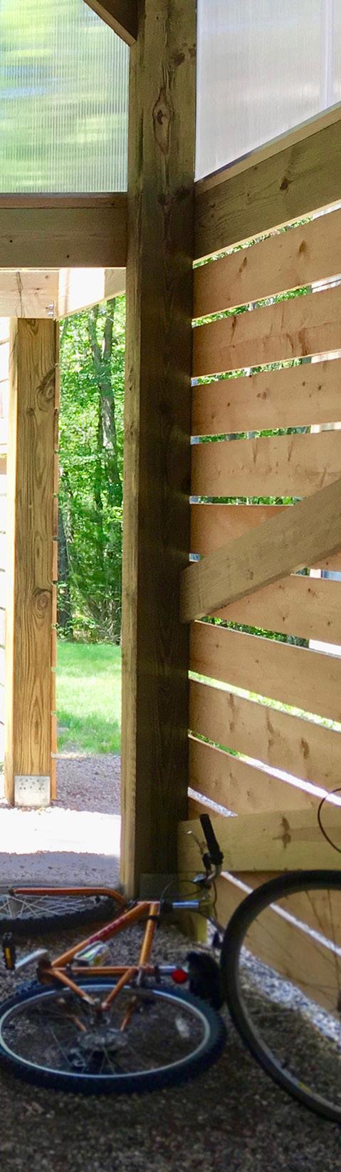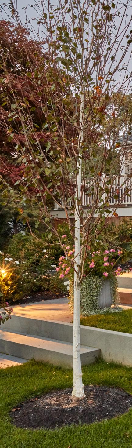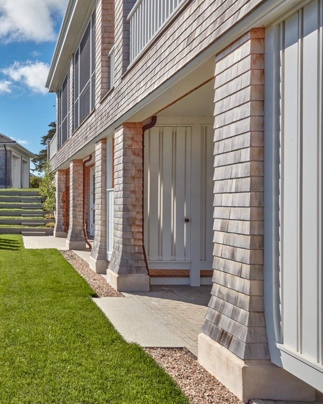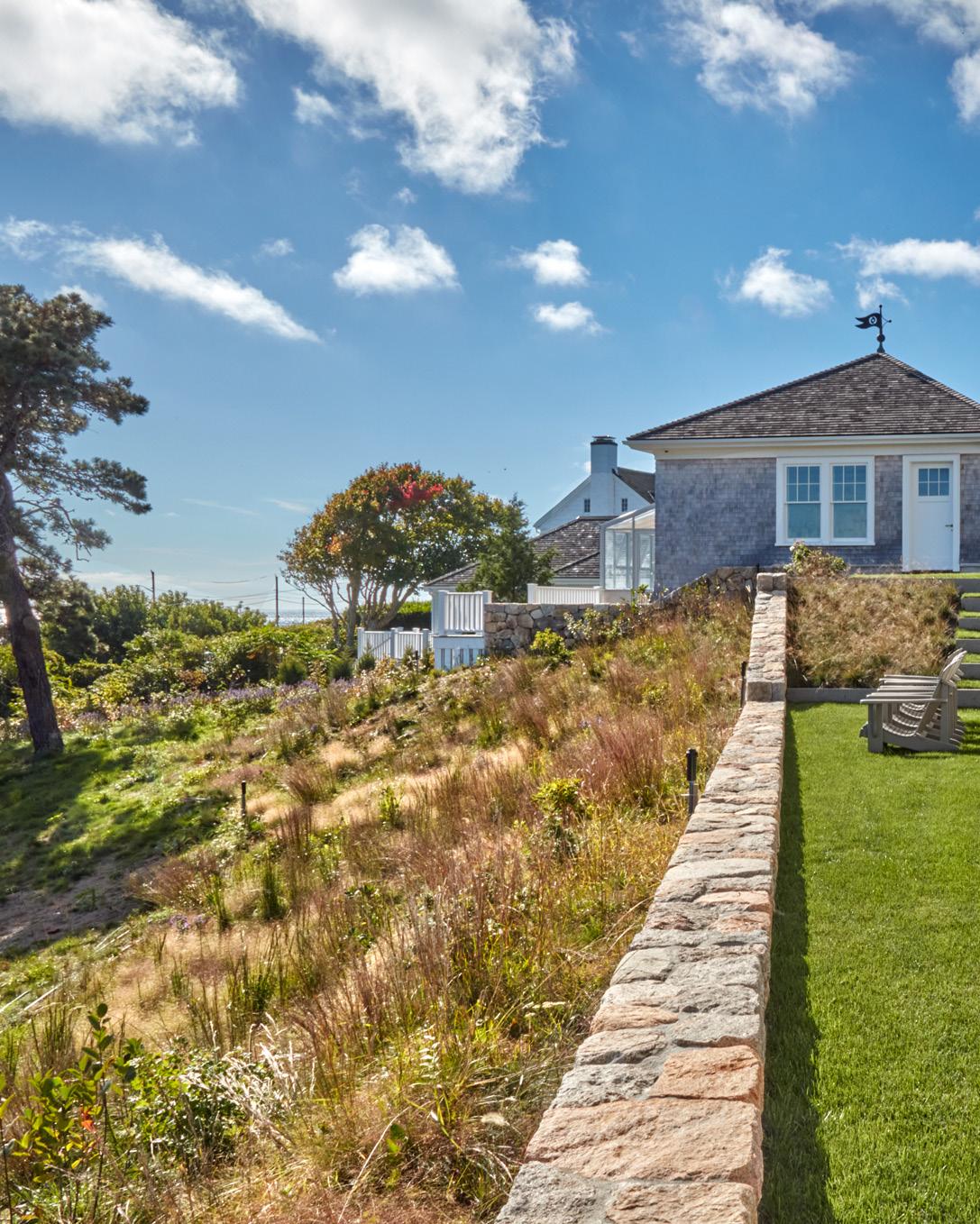 Surrounded by coastal upland forest, this residence was designed to coexist with its context. The house is situated on the southernmost end of the property, with the majority of the landscape consisting of contiguous restored. Layers of native plants in various sizes emulate indigenous communities of plants and allows for natural succession and long-term stability with minimal management. A lowmaintenance fescue lawn provides the canvas for outdoor games and functions as a sloped plane directing runoff to adjacent plantings for cleansing and infiltration. A quarry end slab of bluestone is repurposed as a “sunning” block or a place to sit.