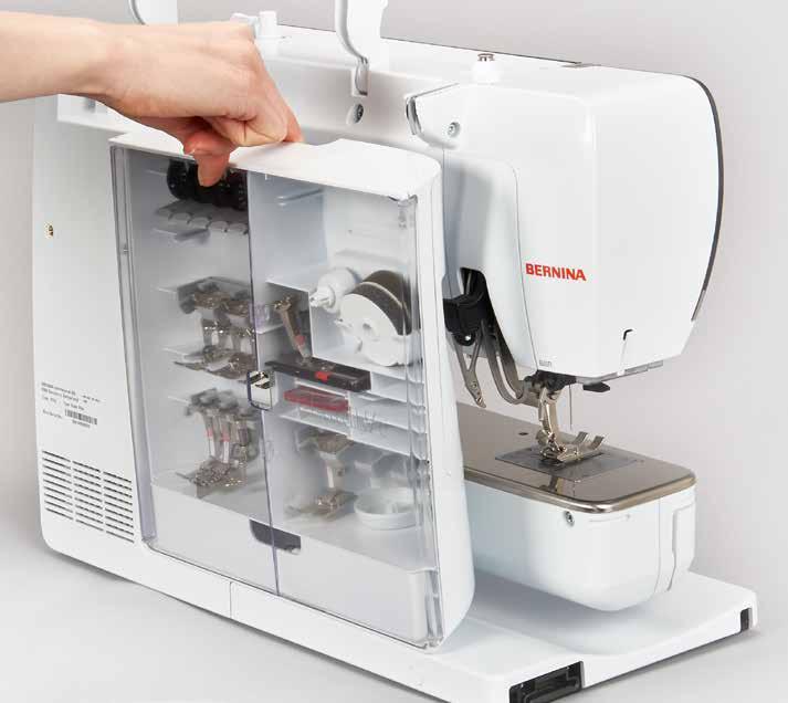 A good variety of BERNINA presser feet come standard. As usual, they are full-shank metal. Also included is a well-designed accessory box that displays the contents clearly. For convenience, it magnetically attaches to the machine.