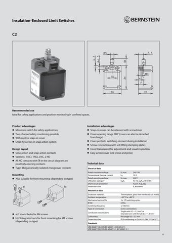 zz Versions: 1 NC / 1NO, 2 NC, 2 NO zz All NC contacts with � in the circuit diagram are positively opening contacts zz Type: Zb (galvanically isolated changeover contact) Mounting zz Also suitable for front mounting (depending on type) a) b)