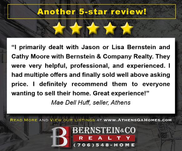 BERNSTEIN co realty athensgahomes.com & cont’d... All Brick Exterior $250,000 3 BR 2 BA | 246 Park Ave, Crawford InDOWNTOWNCRAWFORD2021, we helped 177 clients make a move. Our goal in 2022 is to help 225. Who do you know that is moving and would love 5-star 706-548-HOMECALLservice?US All Brick Exterior $189,900 2 BR 1 BA | 254 Park Ave, Crawford DOWNTOWNCRAWFORD 4 BR 3 BA | 320 Camelot Dr, Athens $279,900 Close to NormaltownUPDATEDKITCHEN