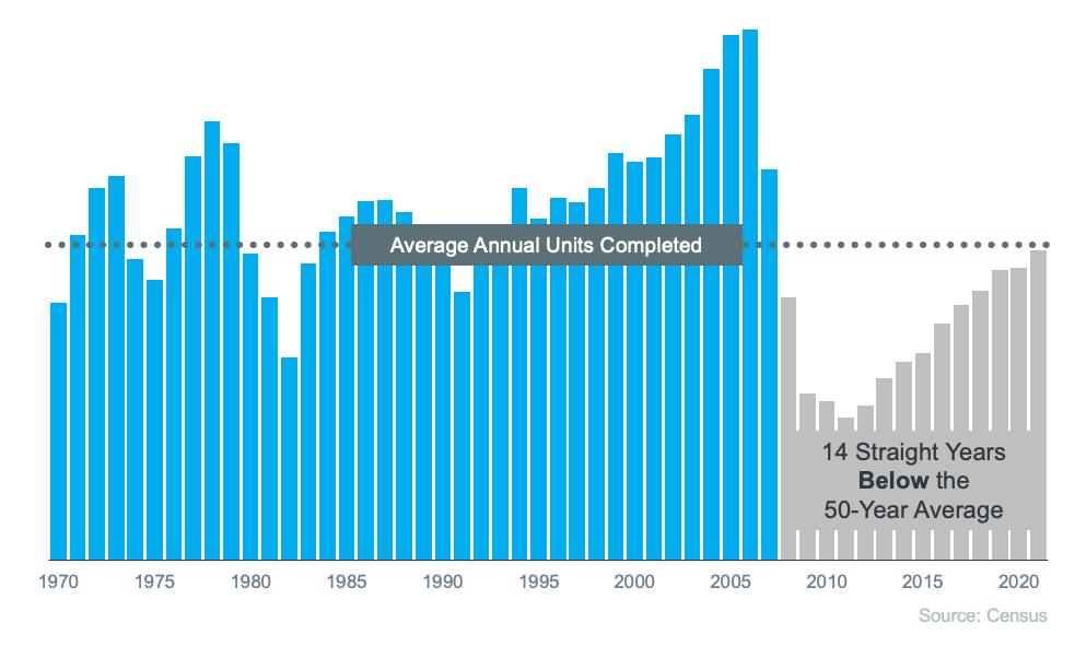 The number of single-family homes that were built in this country in the years leading up to the housing crisis in 2008 shows that right before the crash, homebuilding increased significantly. That’s because buyer demand was so high due to loose lending standards that enabled more people to qualify for a home loan. The resulting oversupply of homes for sale led to prices dropping during the crash and some builders leaving the industry or closing their businesses – and that led to a long period of underbuilding of new homes. And even as more new homes are constructed this year and in the years ahead, this isn’t something that can be resolved overnight. It’ll take time to build enough homes to meet the deficit of underbuilding that took place over the past 14 years.