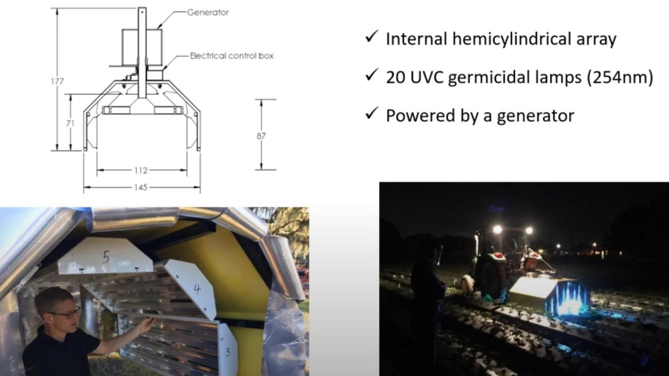 (Top) a UVC light treatment in the small glasshouse trials (Bottom) UVC exposure can cause eye and skin injuries so it’s important to wear protective clothing and face shields. Photo credit: Apollo Gomez, DAF
