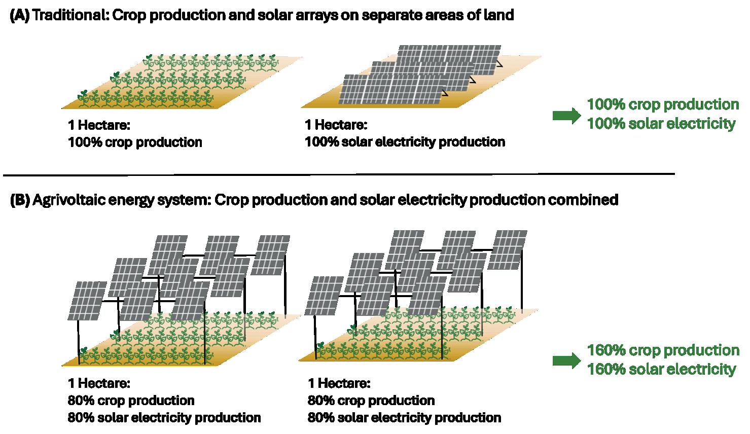 Figure 1. A comparison of the efficiency of (A) traditional farming versus (B) agrivoltaic energy systems. Currently land is mostly allocated to either photosynthesis or photovoltaics - to either grow crops or to generate electricity. As demonstrated by the Fraunhofer Institute for Solar Energy Systems ISE, co-location of both systems is compatible, more resource efficient, reduces competition for land and unlocks new sources of income for farmers. (Diagram redrawn from Fraunhofer ISE.)