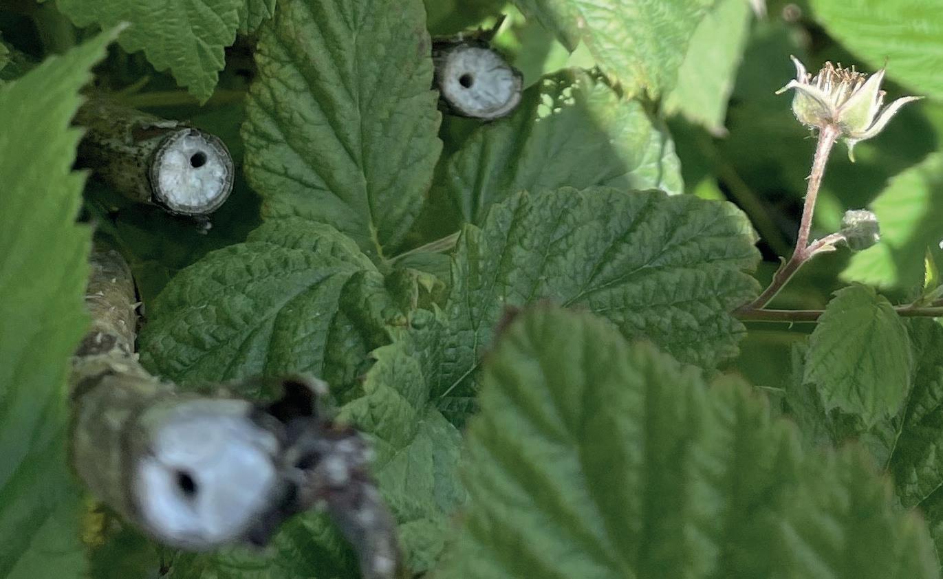 In addition to having the highest Rubus visiting bee diversity, Westerway Farm was also the only Tasmanian farm we surveyed that was actively supporting native reed bees. We observed these key species visiting raspberry, blackberry, and silvanberry flowers on this farm, as well as nesting within raspberry rows inside the long cane stubs that are left in place for several years (Figure 4), giving Reed bees the opportunity to complete their life-cycle.