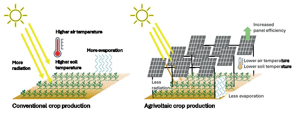 Figure 2. Simplified representation of microclimate beneath solar panels during the day. During the night, temperatures remain higher under agrivoltaic systems with the potential benefit of reducing the incidence of frost.