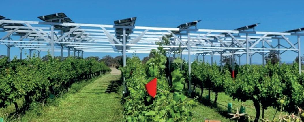 Agrivoltaic farming has the potential to create an advantageous crop growing environment particularly in challenging environments while at the same time helping with the transition to renewable energy. Yet, knowledge about the suitability of different crop types for agrivoltaic farming in Australia is still in its early stages. The exceptions are research on pears (‘panels over pears’) conducted at Agriculture Victoria’s Tatura SmartFarm and a research collaboration on grapevines under panels (‘vitivoltaics’) recently launched across Victoria, South Australia, Tasmania and Western Australia, funded by AgriFutures (Figure 3).