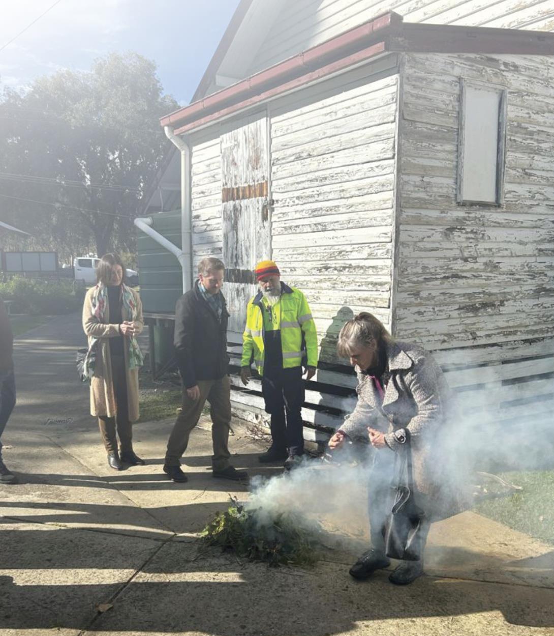 TVN On-Country Managing Director, proud Wiradjuri man, Jebb Hutchison, introduced Duduroa Dhargal Aboriginal Corporation, Elders Uncle Alan Murray and Uncle Phil Murray who led the Welcome to Country and Smoking Ceremony to wish the project great success. We heard from speakers Jim de Hennin, Vice President of the Three Halls Committee, Jane Carney, the Chair of Landcare Victoria and Dr Helen Haines MP, Independent Federal Member for Indi, about the importance of town halls in each community. Dr Haines recalled being at Granya Hall during the bushfires and witnessing first-hand the number of locals utilising the facility.