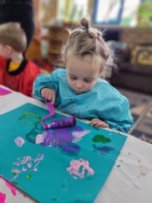 Since the art show, there has been a lot more art experimentation. The younger children are using a variety of markmaking tools, which will build into symbolic drawing and then writing over time. The older children have had fun with different mediums, such as box construction and painting on easels hanging from trees, which helps build their fine and gross motor skills and problem-solving skills.