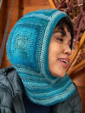 A balaclava made with crocheted motifs which are joined together. Neck is crocheted in the round.