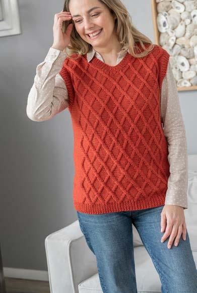 A smart vest worked from the bottom up in the round with a delicate cabled twist pattern. Back and front are separated at the underarms and worked in rows to the shoulders.