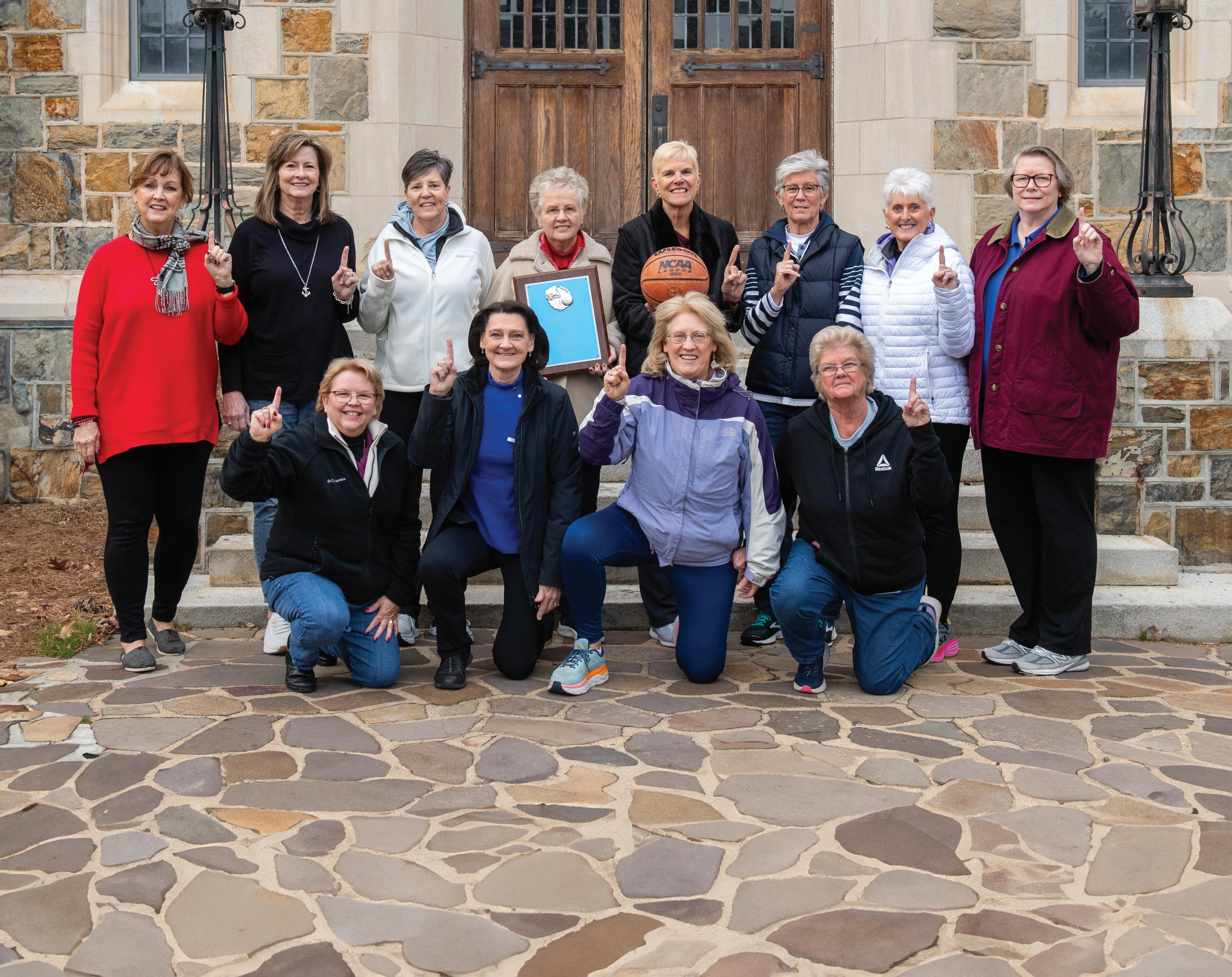 The women responsible for Berry’s first national championship in any sport are all smiles as they recreate the photo taken after their triumphant return to campus in 1976.