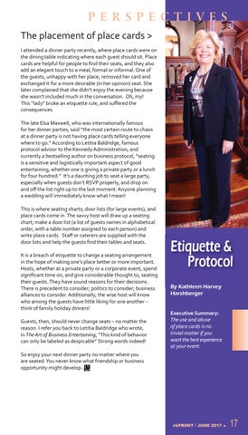 PERSPECTIVES The placement of place cards > I attended a dinner party recently, where place cards were on the dining table indicating where each guest should sit. Place cards are helpful for people to find their seats, and they also add an elegant touch to a meal, formal or informal. One of the guests, unhappy with her place, removed her card and exchanged it for a more desirable (in her opinion) seat. She later complained that she didn’t enjoy the evening because she wasn’t included much in the conversation. Oh, my! This “lady” broke an etiquette rule, and suffered the consequences. The late Elsa Maxwell, who was internationally famous for her dinner parties, said “the most certain route to chaos at a dinner party is not having place cards telling everyone where to go.” According to Letitia Baldridge, famous protocol advisor to the Kennedy Administration, and currently a bestselling author on business protocol, “seating is a sensitive and logistically important aspect of good entertaining, whether one is giving a private party or a lunch for four hundred.” It’s a daunting job to seat a large party, especially when guests don’t RSVP properly, and drop on and off the list right up to the last moment. Anyone planning a wedding will immediately know what I mean! This is where seating charts; door lists (for large events), and place cards come in. The savvy host will draw up a seating chart; make a door list (a list of guests names in alphabetical order, with a table number assigned to each person) and write place cards. Staff or caterers are supplied with the door lists and help the guests find their tables and seats. It is a breach of etiquette to change a seating arrangement in the hope of making one’s place better or more important. Hosts, whether at a private party or a corporate event, spend significant time on, and give considerable thought to, seating their guests. They have sound reasons for their decisions. There is precedent to consider; politics to consider; business alliances to consider. Additionally, the wise host will know who among the guests have little liking for one another – think of family holiday dinners! Guests, then, should never change seats – no matter the reason. I refer you back to Letitia Baldridge who wrote, in The Art of Business Entertaining, “This kind of behavior can only be labeled as despicable” Strong words indeed!