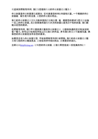 在帮助写作网,我们不仅提供高质量的作业封面设计,还提供快速的交付和友好的 客户服务。您可以轻松地在网站上浏览我们的作品,并与我们的设计师直接沟通,确 保您的作业封面完全符合您的要求。