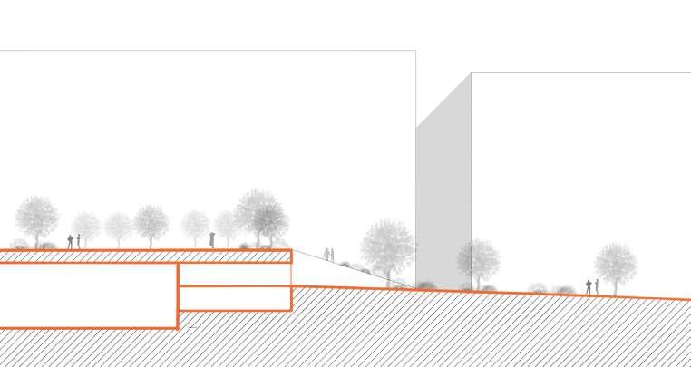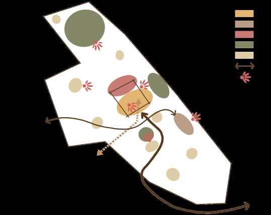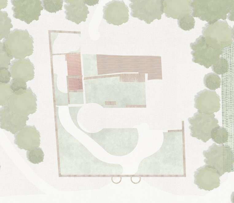 La parcelle est aménagé comme une toile de fond permettant de rejoindre les différents pôles du programme à travers des aménagements paysagers de repos et de circulations. Ce sont des lieux de croisement et d’échange entres les différents flux du programme. Cela est aussi visible au sein de la ruine ou des espaces partagés entre les cuisiners et les visteurs prennent place dans les espaces extérieurs.