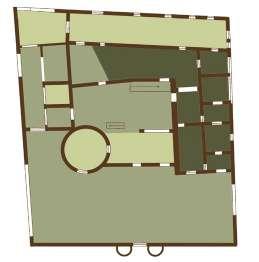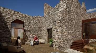 Les classes sont accessbile par un cheminement depuis la ruine permettant un séquencage : extérieur à travers le paysage, couvert et semi enterré entre le mur de la classe et la végétation puis intérieur avec une vue le paysage agricole depuis la classe. Une continutié matérielle est réalisé entre cette extensions et celles présentes dasn les ruines. D’une part, le sol est recouvert par une mosaique identitque à celle que l’on retrouve dans les cuisines et d’autre part, les façade reprennent le même language architectural de mur rideau en arrière d’une trame porteuse en acier auto-patinable. Un patio, entre les deux classes, vient faire echo à celui à l’intérieur de la ruine.