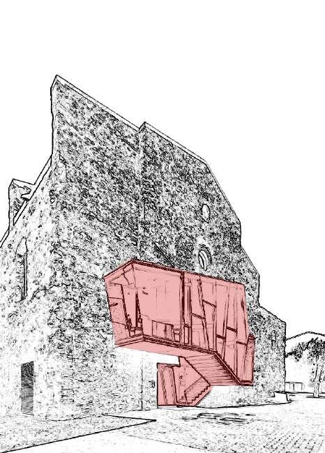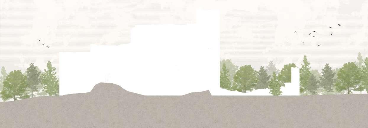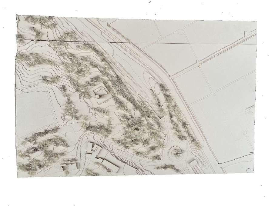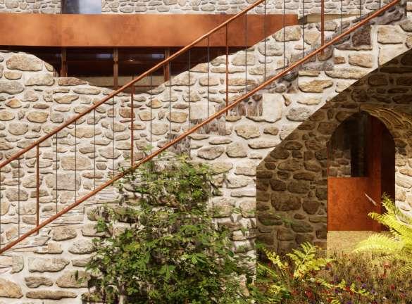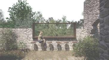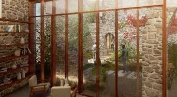 L’intervention ne concurrence pas la ruine. Elle la souligne en donnant à voir ces vestiges. Les formes créées prennent le partie de se couler à travers les interstices et porosités de la ruine. Cependant, cette intériorité et discrétion architecturale n’est pas dissociée de la reconnection au territoire avec l’amplification de la connection visuelle à ce dernier. La végétation aujourd’hui obstruante est retravaillée de manière à créer des percées visuelles ponctuelles à plusieurs endroits du site. La forte topographie à l’Est de la ruine est utilisé pour l’installation de vignes permettant, depuis les espaces de travail du rez-de-jardin de se connecter au paysage agricole et lointain. Accentuée par les nouvelles ouvertures en façade Est. Ce projet ambitionne de placer les espaces propres à l’institut et les espaces agricoles comme des caractéristiques centrales à l’expérience du lieu. Pour cela, les parcours mis en place les renderont visibles. Cela permet de sensibiliser le grand public et mettre en avant le travail des chefs.