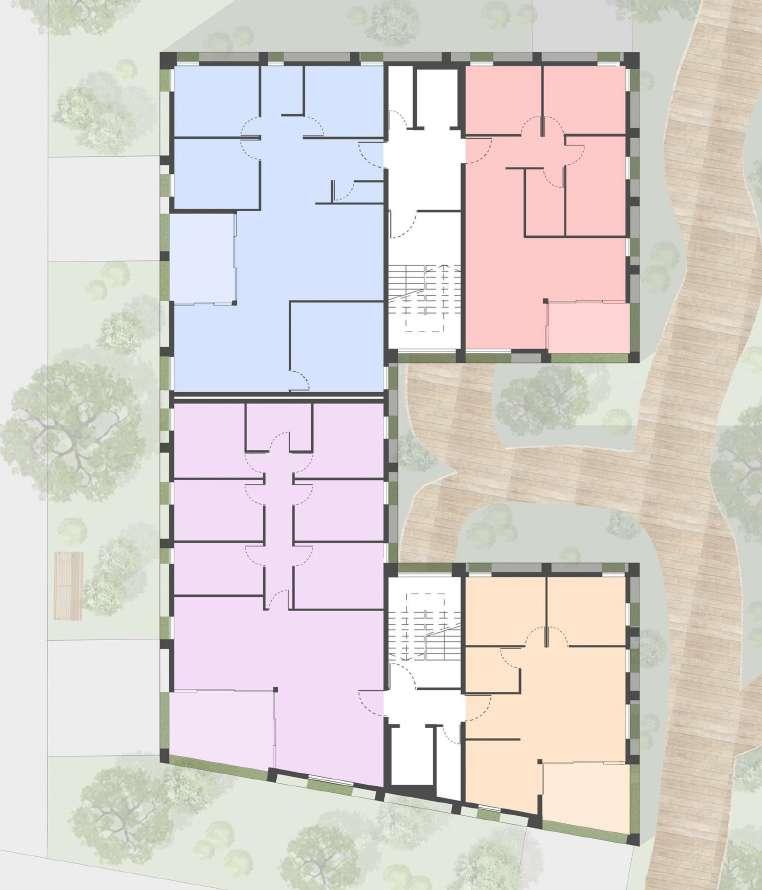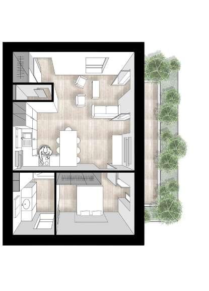 Le rez-de-chaussée peut être actif, comme c’est le cas dans les plans exposés avec, au Nord, un café et sa terrasse extérieure. L’entrée pour les logements est alors marquée par un traitement au sol différent. Les logements vont du plus grand au plus petit en montant. Les intérieurs sont très intimistes, la terrasse est protégée du monde extérieur par les arbres et arbustes. Tandis que la largeur des espaces de circulation favorise les échanges entre voisins.