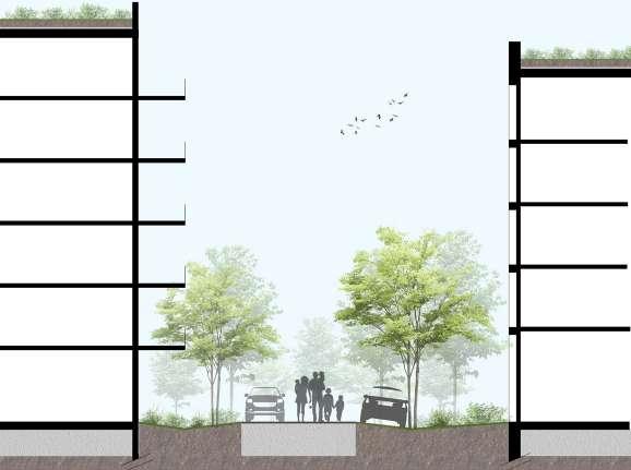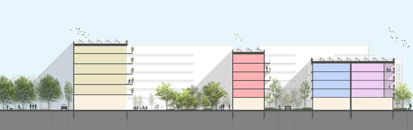 Afin de préserver les habitants des nuisances sonores et leur garantir de l’intimité, les immeubles sont positionnés avec un retrait de 5m par rapport à la rue. Ce retrait est traité par un aménagement paysager. De plus, les bâtiments proches d’une route passante ont des rez-dechaussées actifs accessibles pour tous avec une matérialité au sol identique à celle de la rue.