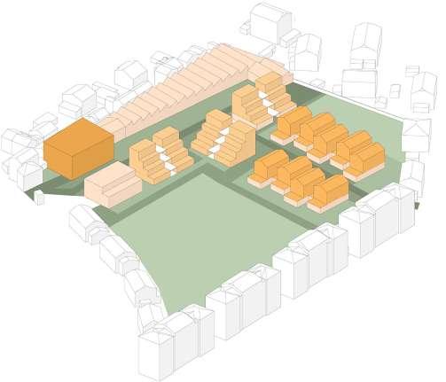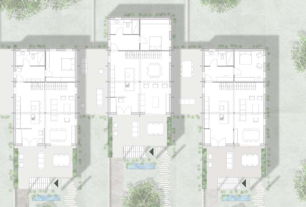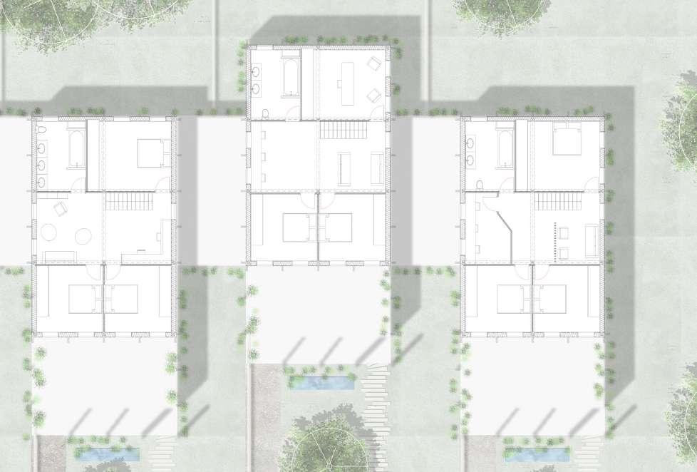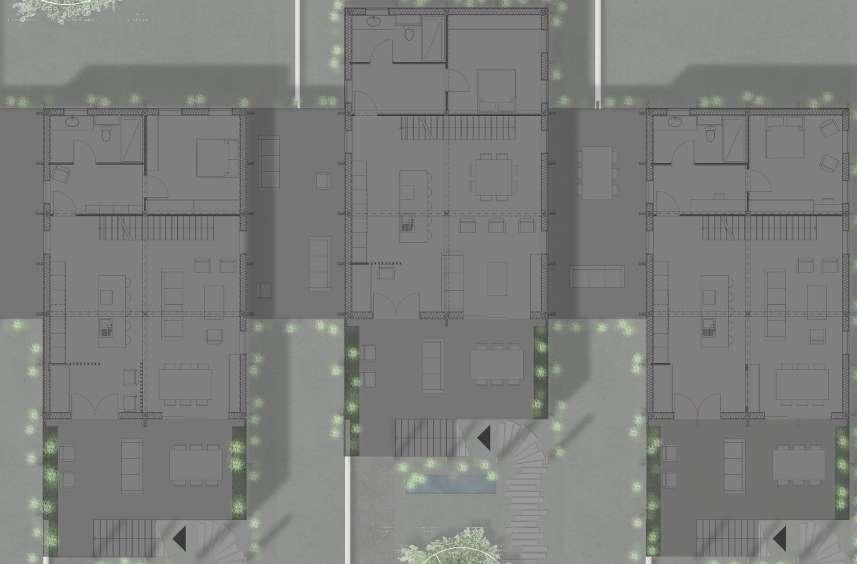 La mise en quiconce des unités de logements permet d’éviter le vis-à-vis au niveau des chambres. Cette notion d’intimité est aussi gérée au niveau du seuil, en effet, l’ensemble est placé en retrait par rapport à la rue. Un premier chemin permet d’accéder à l’espace d’activités de chaque logement situé au rez-dechaussée. Un second cheminement, d’une autre matérialité arrive jusqu’aux escaliers du logement derrière un claustra donnant sur une terrasse privée. Ces différentes étapes marques plusieurs passages visant à distancier le logement du flux public. Les espaces extérieures entre les logements sont des terrasses partagées entre les voisins afin de créer une vie en communauté. L’accés au jardin arrière se fait depuis l’espace de travail.