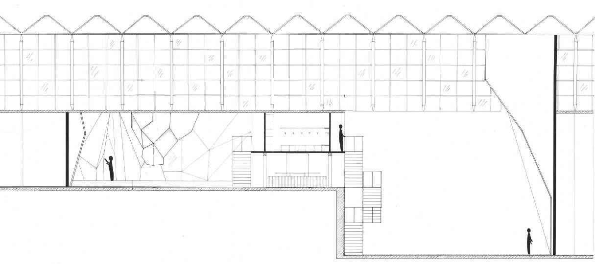 À droite, le sol a été abaissé et le plafond entre les étages est enlevé. Cela permet d’obtenir une hauteur suffisante pour créer une salle de difficulté (des voies). Le hall d’entrée donne un point de vue intéressant sur les grimpeurs sans avoir besoin de se tordre le cou. Coupe longitudinale