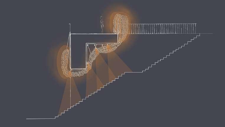 Pour cela, notre structure est composée de gobelets en plastique translucide, transparents ou colorés placés dans les mailles d’un filet de pêche. Ce dernier est suspendu au plafond de l’escalier. Des spots lumineux viennent créer des jeux de lumières sur les marches. Depuis le haut des escaliers, l’installation remonte au-dessus du garde corps formant une immense vague de plastique.