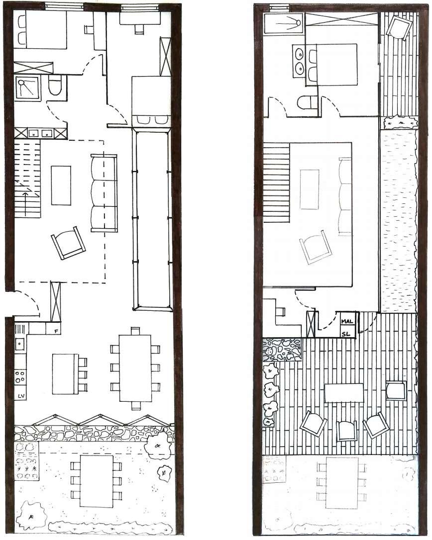 Les salles communes sont principales dans leur fonctionnement, elles sont donc placé au Sud et au coeur du logement. Le salon bénéficie d’une double hauteur et malgré sa position centrale il n’est pas sombre grace à la verrière à l’étage et à la piscine tombant à ce niveau. La cuisine et la salle à manger où ils aiment recevoir donnent sur un jardin extérieur et un potager séparé par une baie en accordéon. Au Nord, se trouve un premier espace nuit pour les deux amis qui partagent une salle de bain.