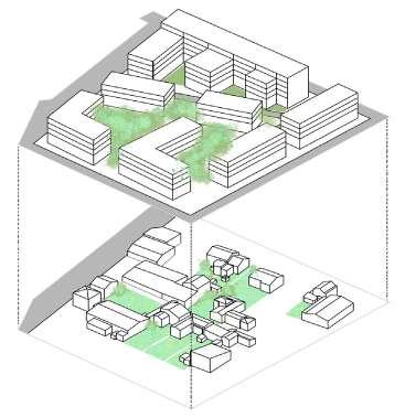 L’apport de logements était aussi une nécessité car le site en était dépourvu. Les immeubles ont alors été imaginé en fonction des flux publics puis des plus semiprivés afin de déterminer les formes. Les hauteurs varient afin que l’apport d’ensoleillement soit maximal pour tous.