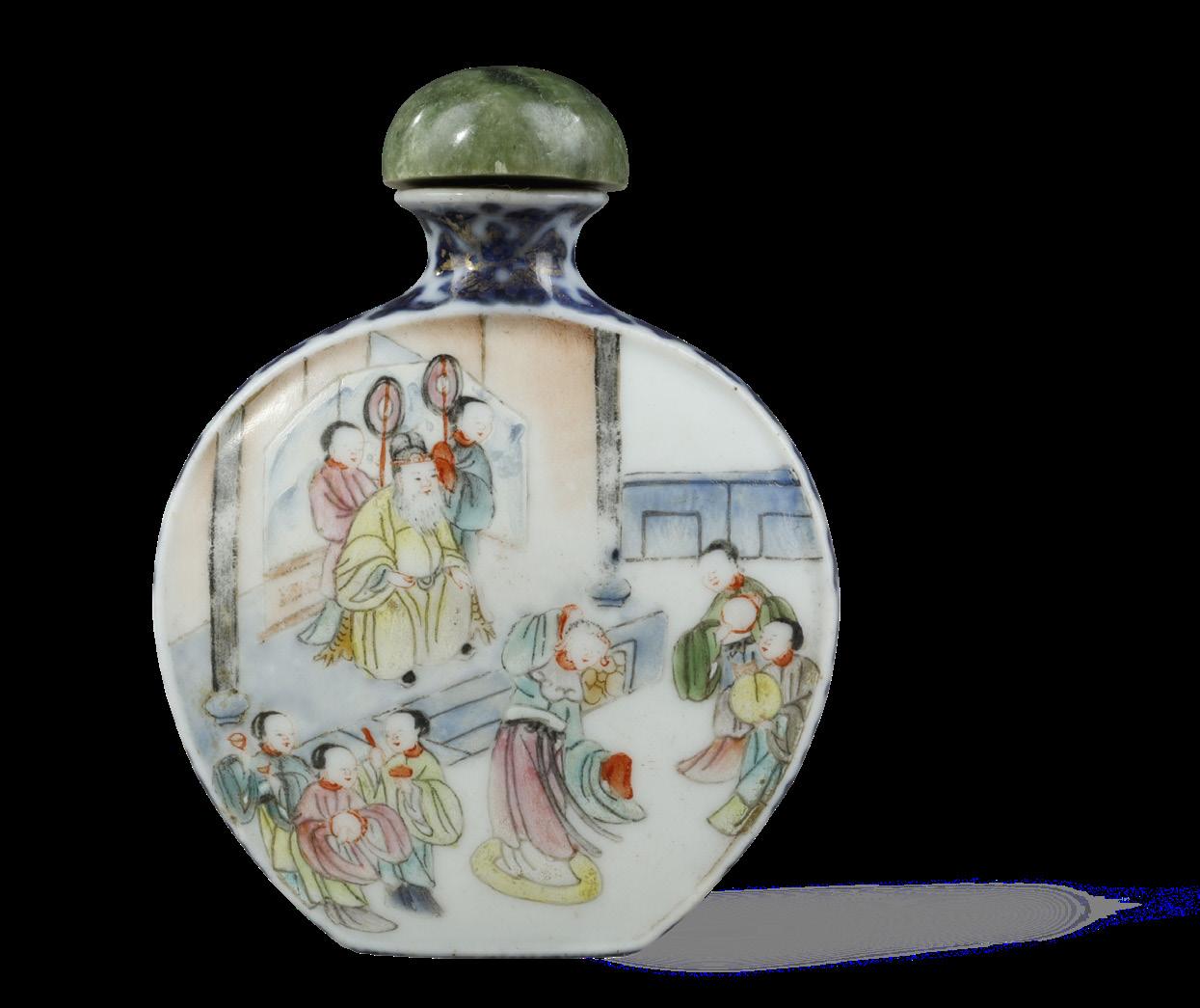 Tabatière en porcelaine polychrome à décor de personnages évoluant devant un Empereur : une scène de danse et la cueillette des lotus, scène traditionnelle à laquelle prend habituellement part l’Impératrice et qui a lieu à la Cité Interdite, dans des panneaux sur chaque face, la tranche et le col ornés de rinceaux de fleurs en bleu de cobalt sous couverte.