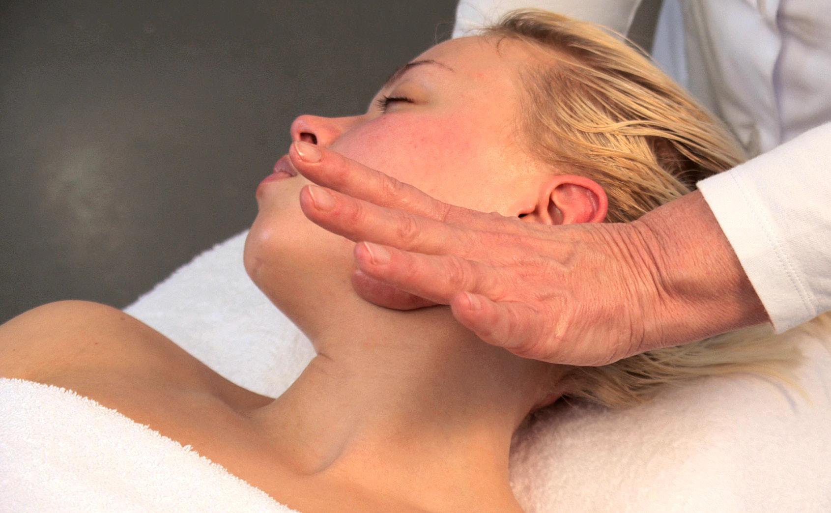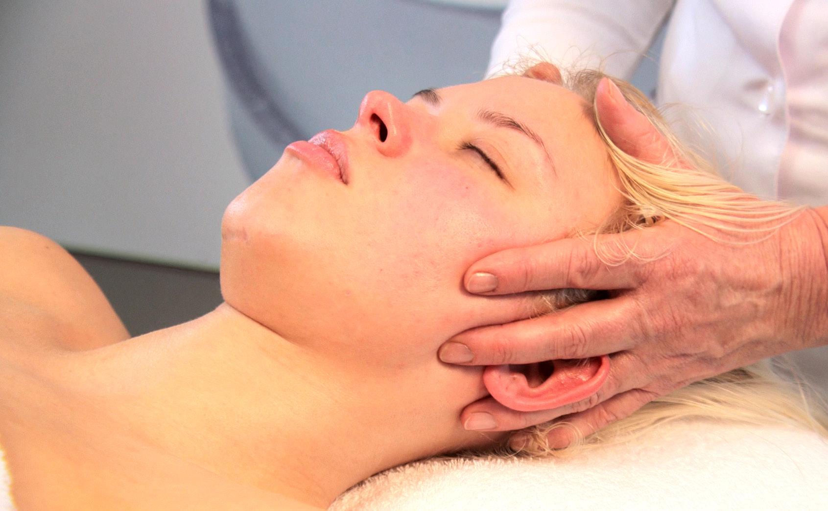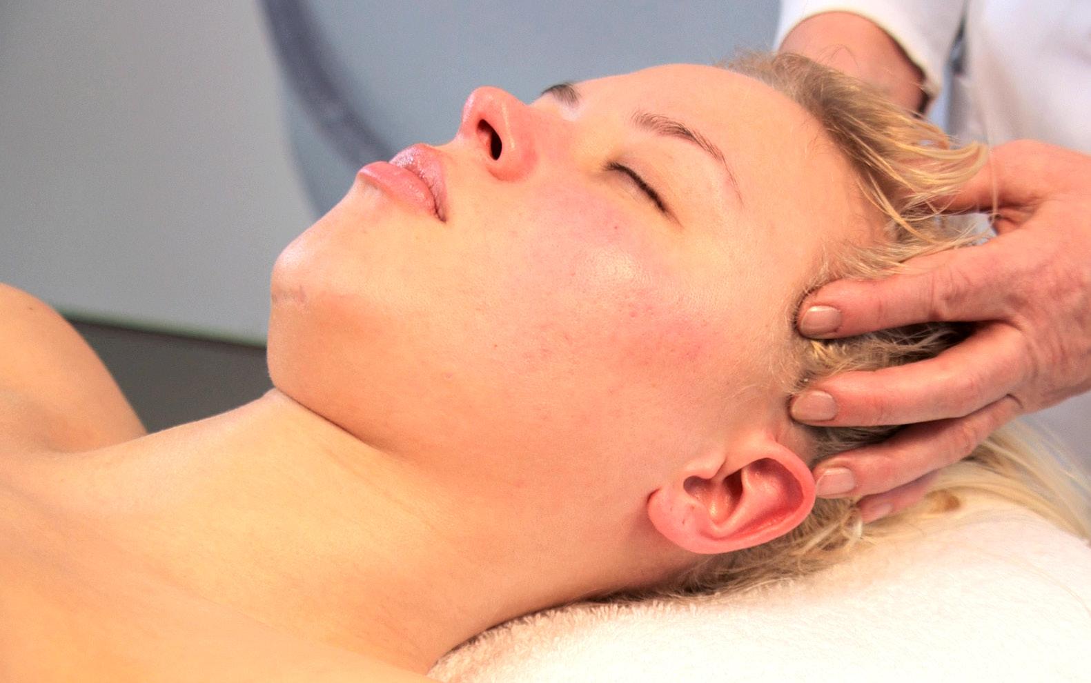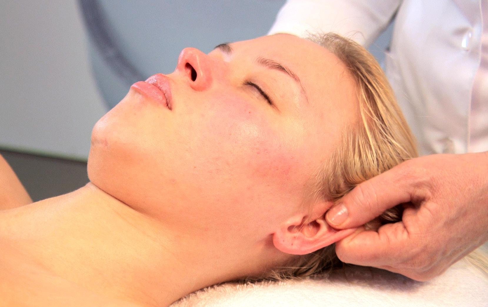 Stap 16: Masseer de oorlelletjes met een strekkende beweging richting de voeten van de cliënt. Eerst drie keer naar de massagebank en daarna drie keer naar achteren. Daarna ga je naar de bovenkant van het oor en trek je het oor als het ware een beetje naar je toe. Je maakt dus een strekkende beweging naar boven. Dit doe je wederom drie keer. Voer tot slot deze stap (alle grepen) in totaal drie keer uit in één beweging.