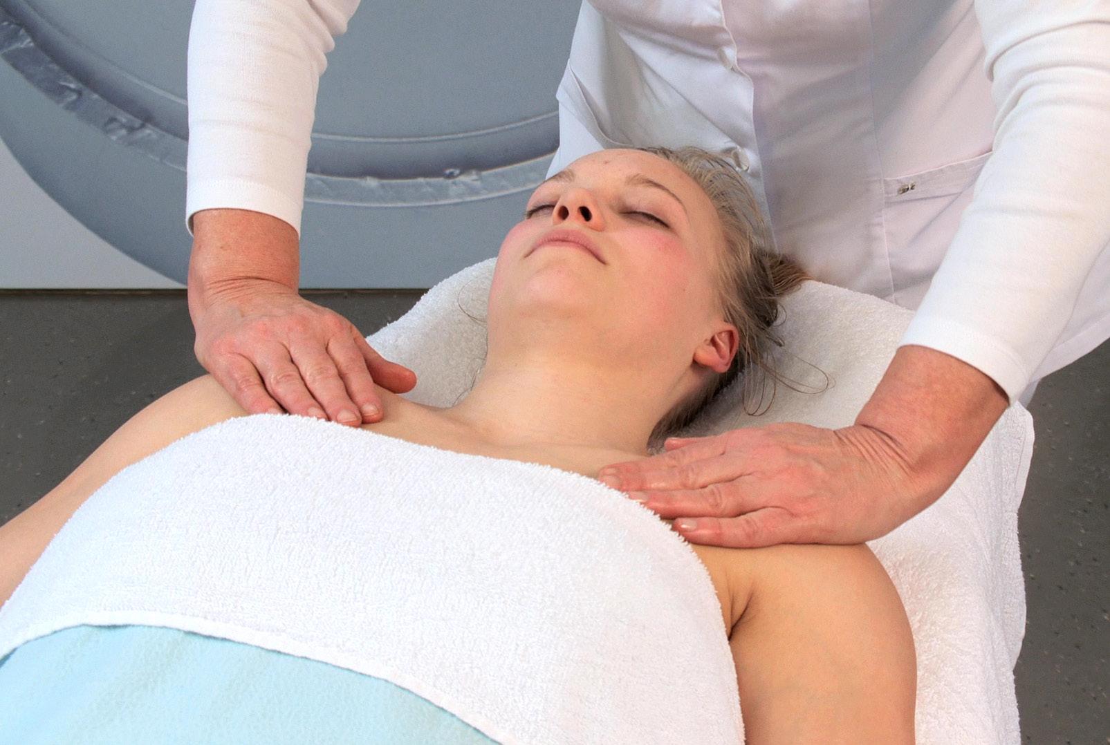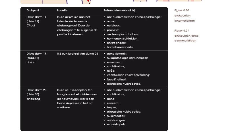Stap 19, baan 1 (wijziging): Zet je duim tegen de kaakrand aan de voorzijde van de borstbeensleutelbeentepelspier en glijd voorzichtig en langzaam naar beneden naar de achterzijde van de spier tot in de hoek met het sleutelbeen. Deze greep moet minimaal 13 seconden duren. Ga vervolgens links richting de schoudertop. Leg je vingers neer, draai om de schoudertop en blijf de longmeridiaan volgen met je duim. Geef druk op Long 5 en ga via Long 6 en Long 7 naar Long 9 op de polsplooi (binnenzijde onderarm). Via effleurage ga je via Dikke darm 11 (bij de elleboog), achterlangs de arm en schouder terug naar boven. Behandel deze baan in totaal drie keer.
