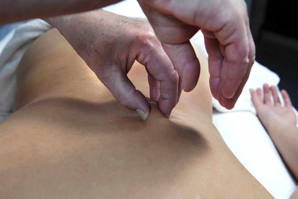 Stap 25: Glijd vervolgens via de schoudertoppen richting Long 5 en geef ook hier druk. Glijd terug naar de nek, strek het hoofd en glijd weer terug richting Long 5. Deze stap voer je drie keer uit. Vervolgens strijk je af.