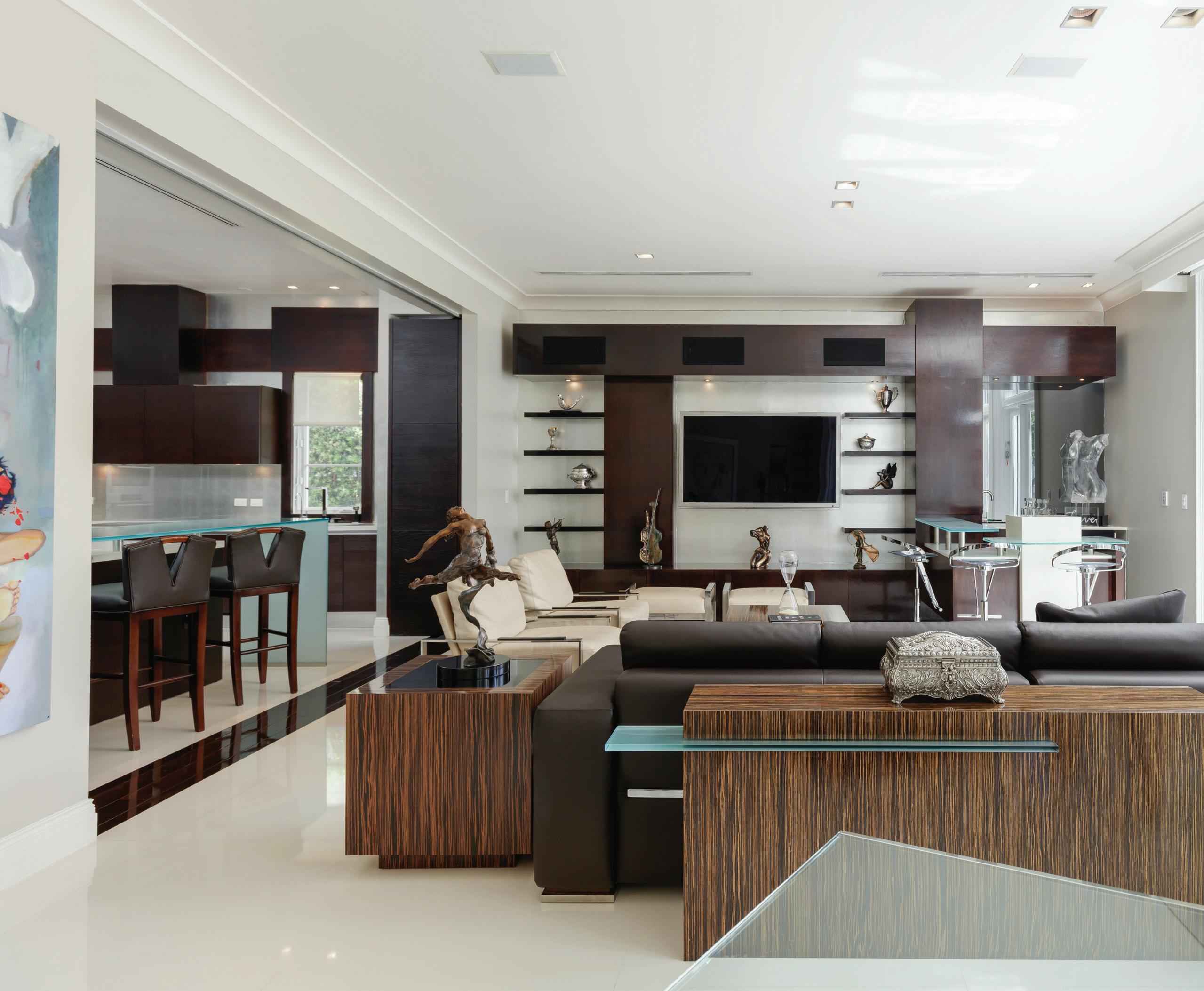 A retractable glass wall separates the kitchen from the family room, where a breakfast area, a bar, and access to the built-in barbecue allow for day-to-night dining and leisure.