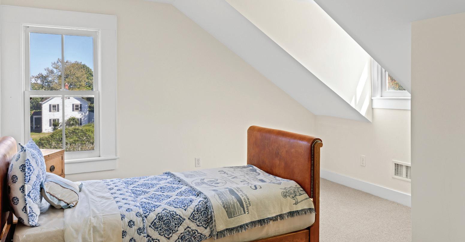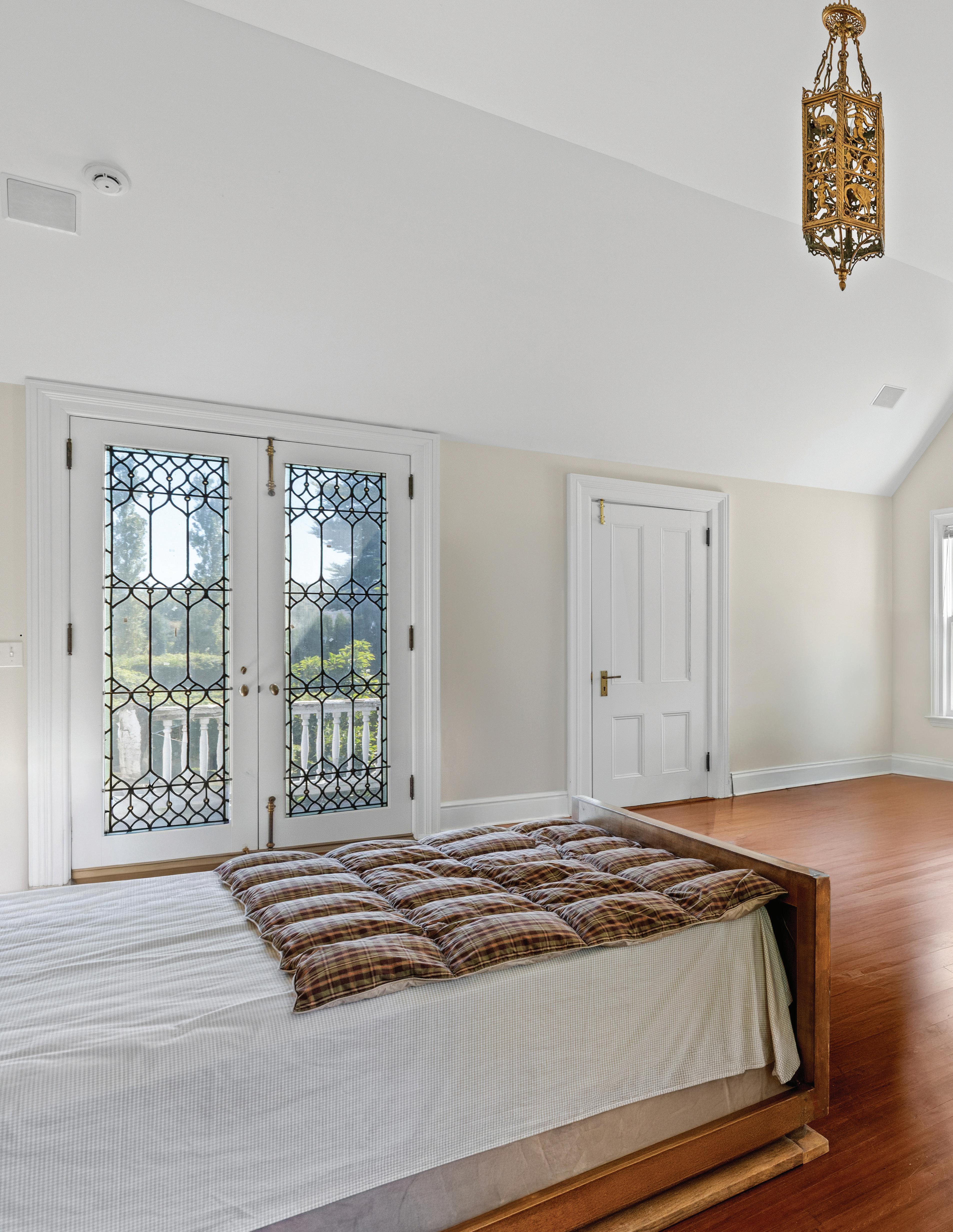 The home’s 5-bay façade with clapboard siding, gable rooflines, Italianate overhang, and welcoming front porch evokes the classic architecture of Southampton’s storied past. The red roof — once a defining landmark of Red Top Farm — crowns the residence, tying today’s elegance to its 19th-century roots. Set within expansive lawns shaded by mature specimen trees, the property offers a balance of privacy and pastoral beauty.