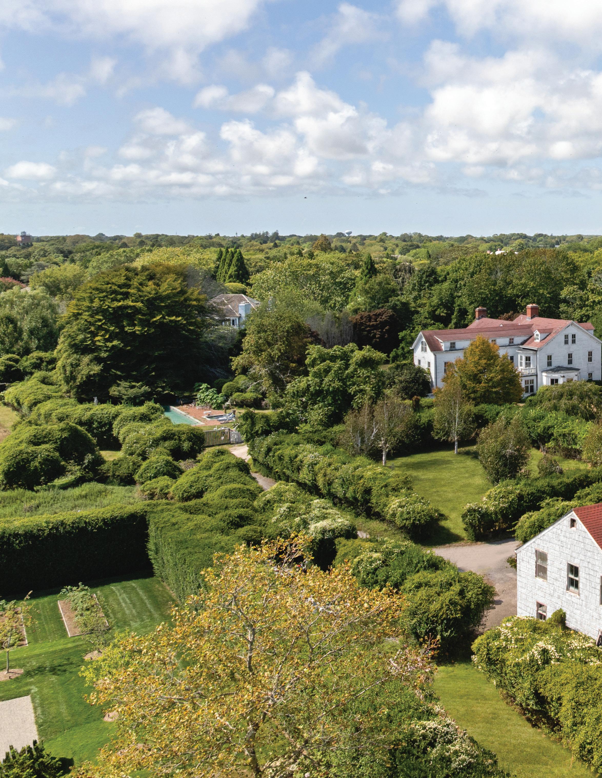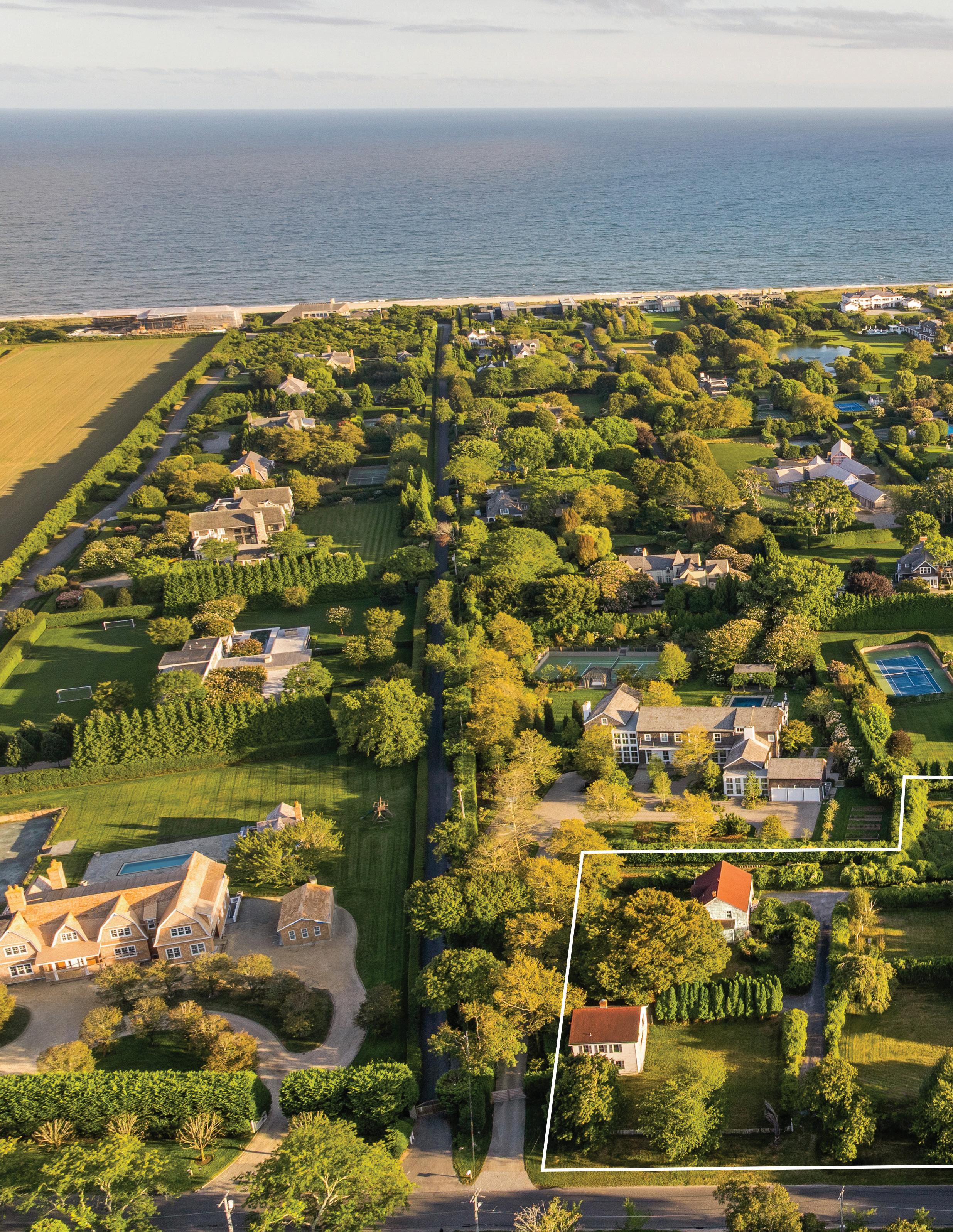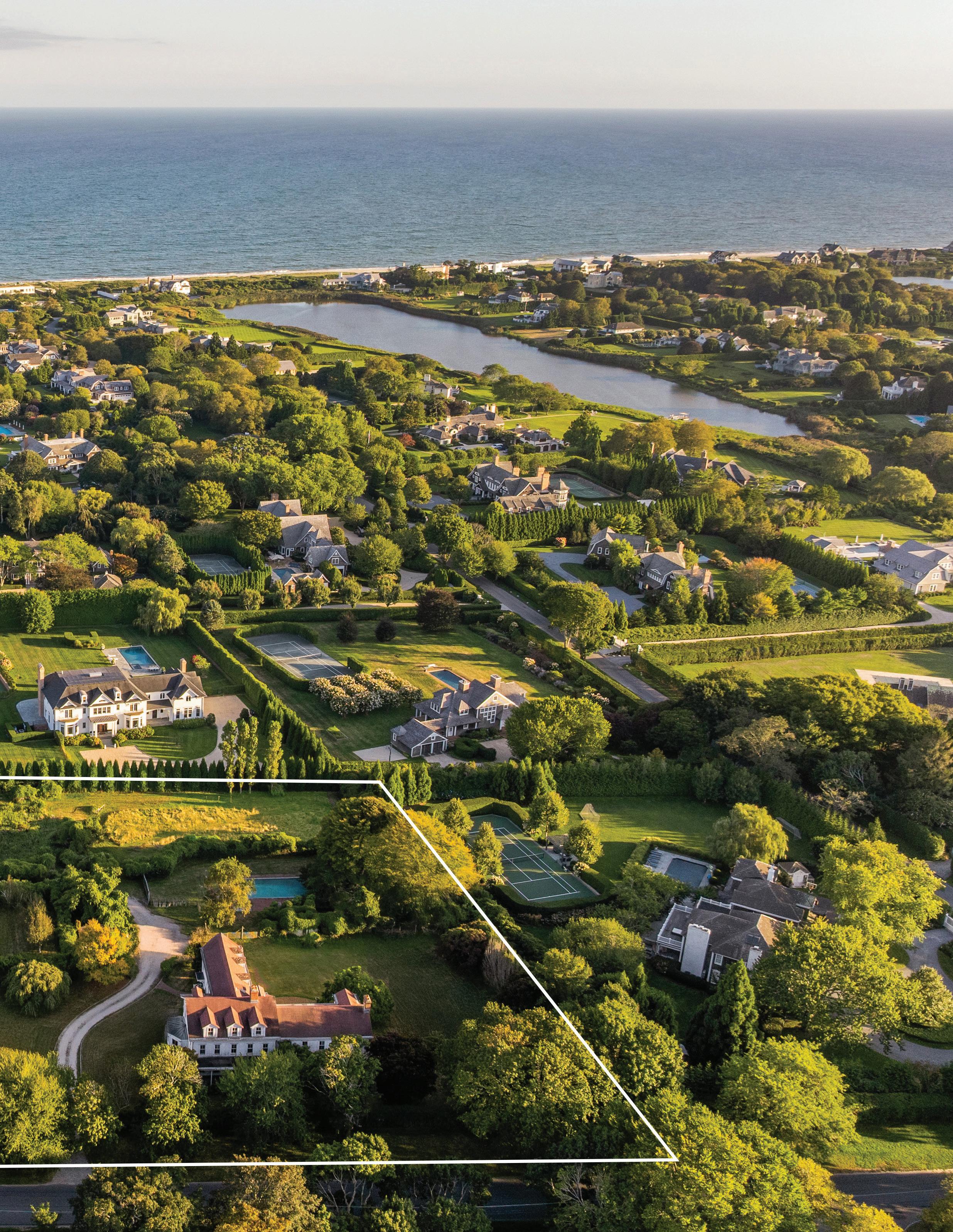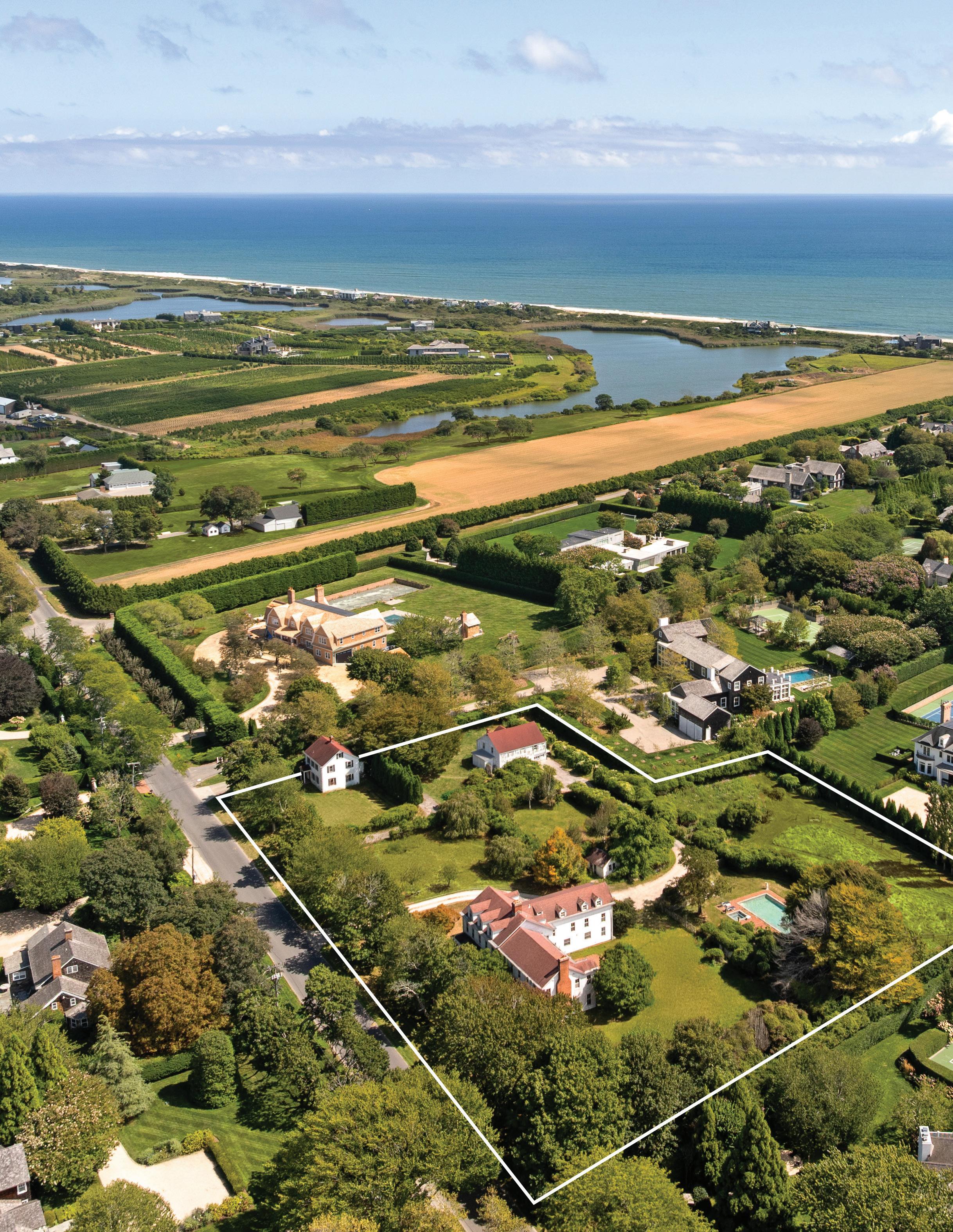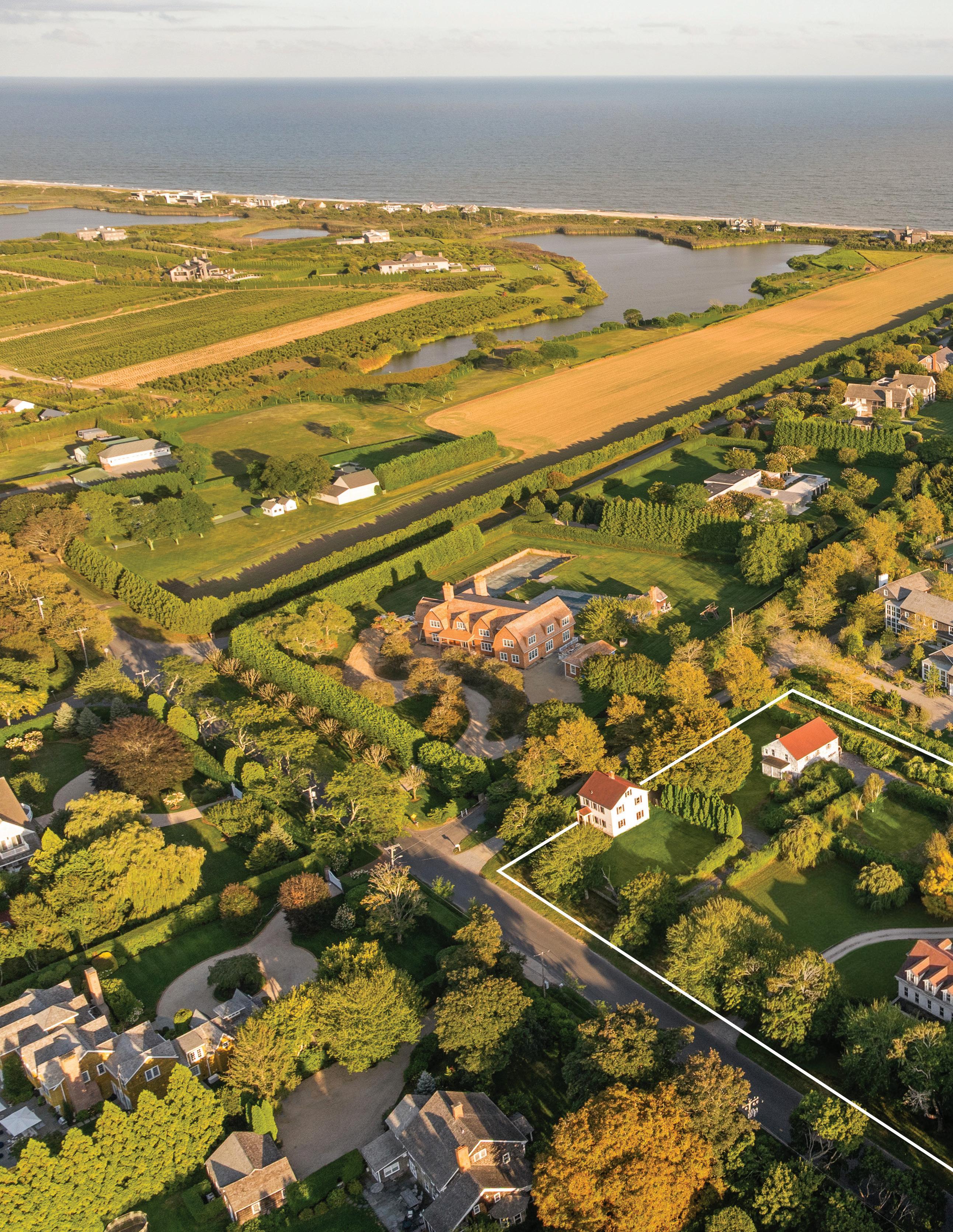 Moments from pristine ocean beaches and Southampton Village, the estate sits south of the highway amid protected farmlands. Expansive lawns, specimen trees, and tall privet hedges provide privacy and a bucolic backdrop while keeping the village and ocean within easy reach.