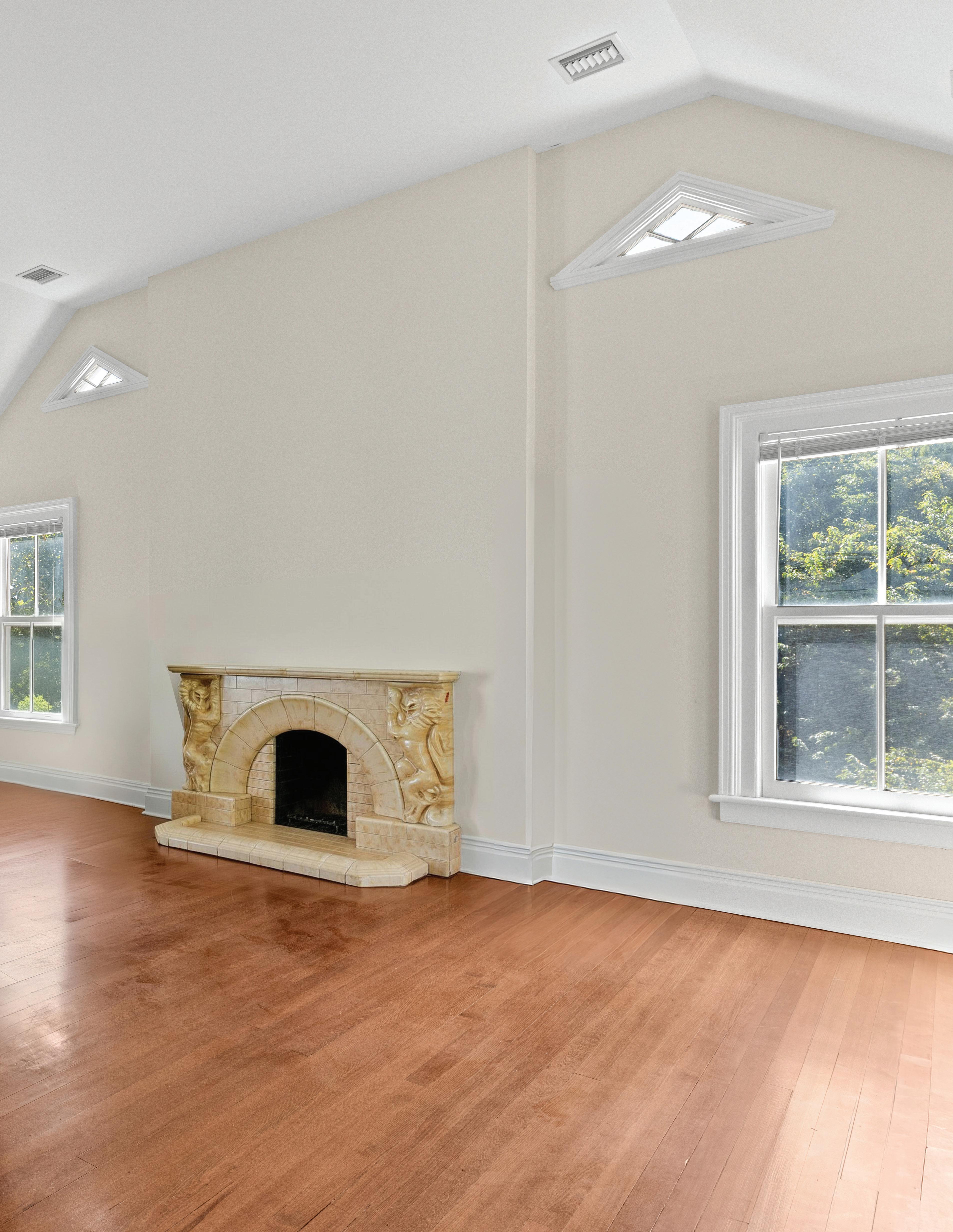 The 2,915 SF+/- second level is centered on the primary suite, a vaulted retreat with a wood-burning fireplace, a walk-in closet, and an en-suite bathroom.