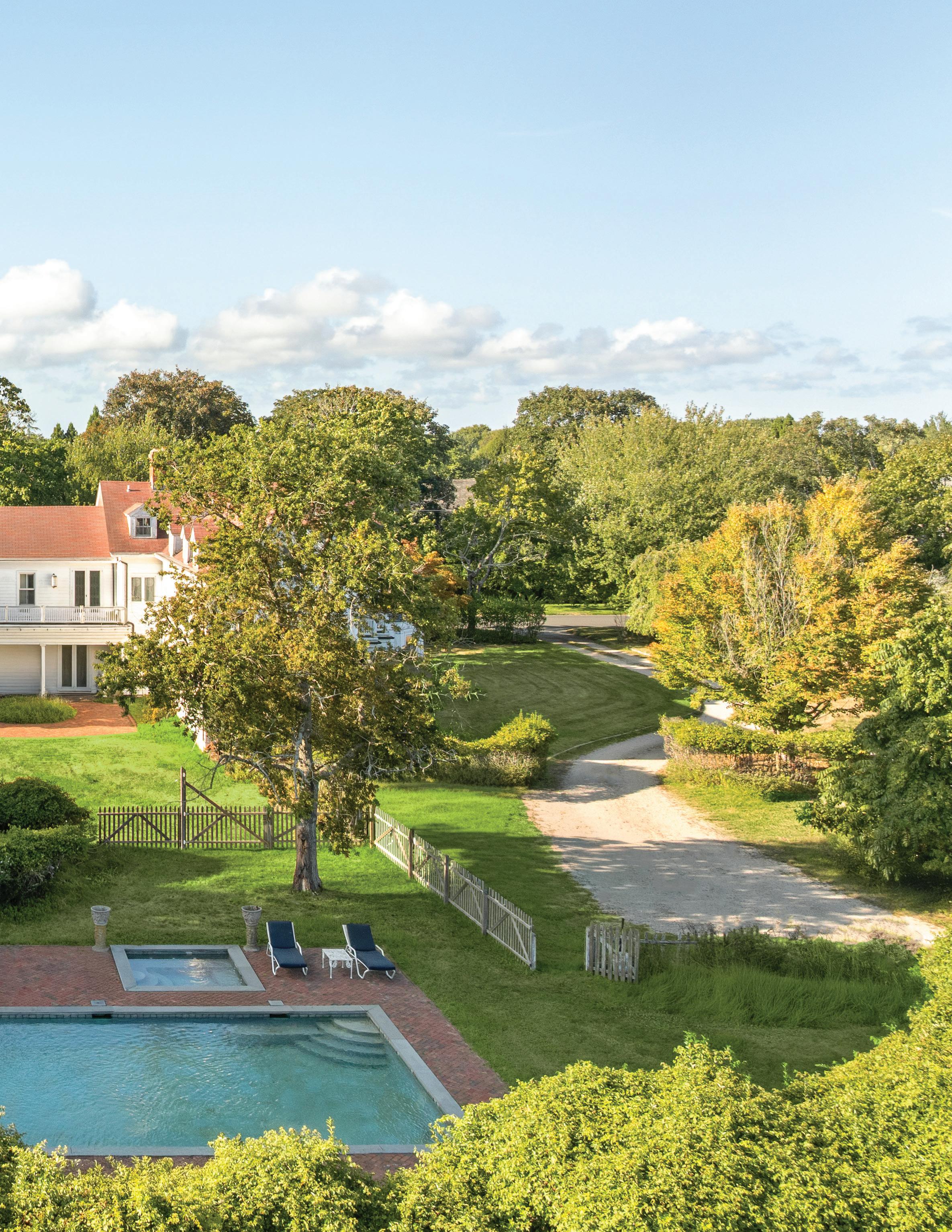 The grounds also include a paddock and equestrian amenities, reflecting the property’s agricultural heritage, while manicured hedgerows, gardens, and treelined perimeters speak to its evolution into a refined Southampton retreat.