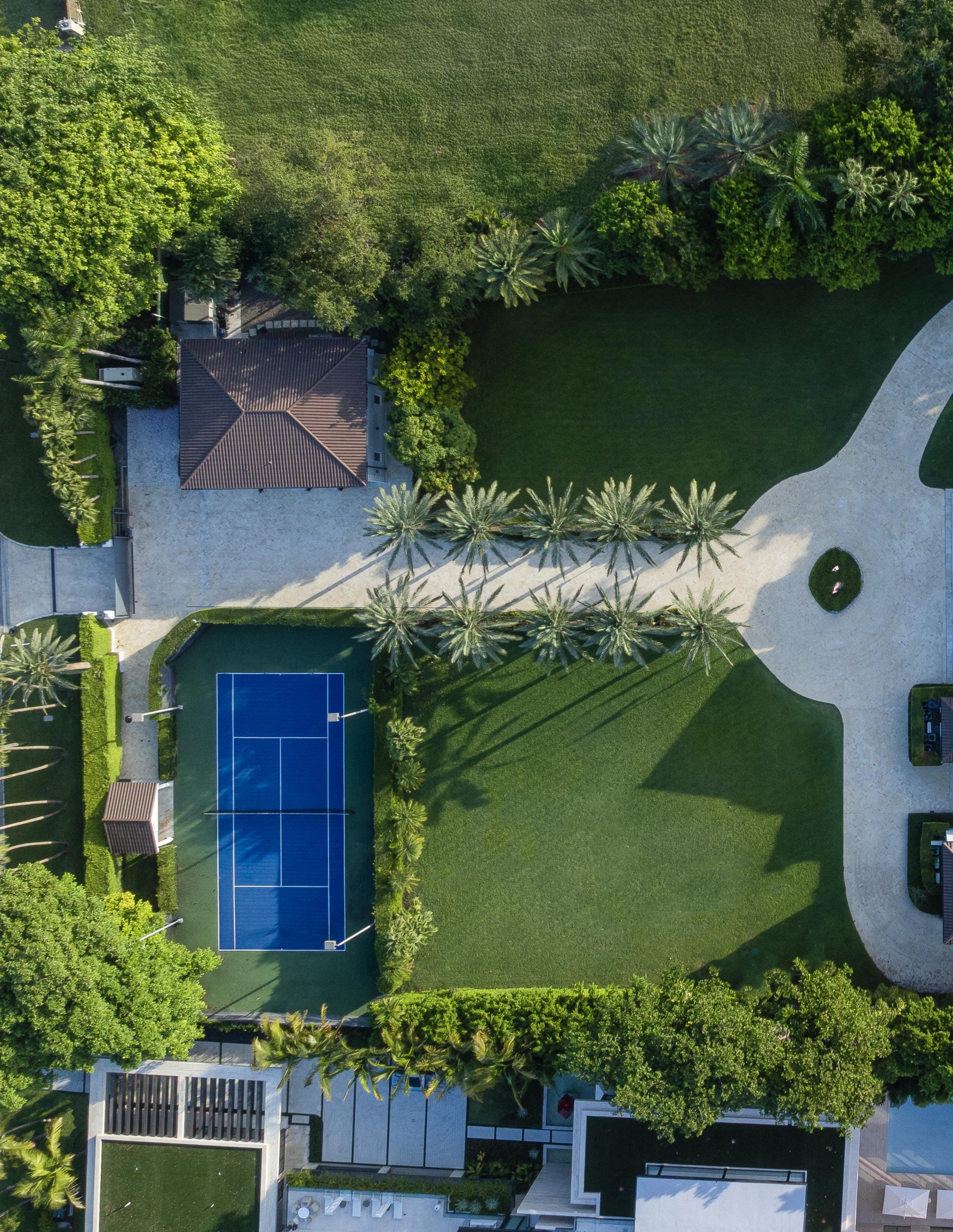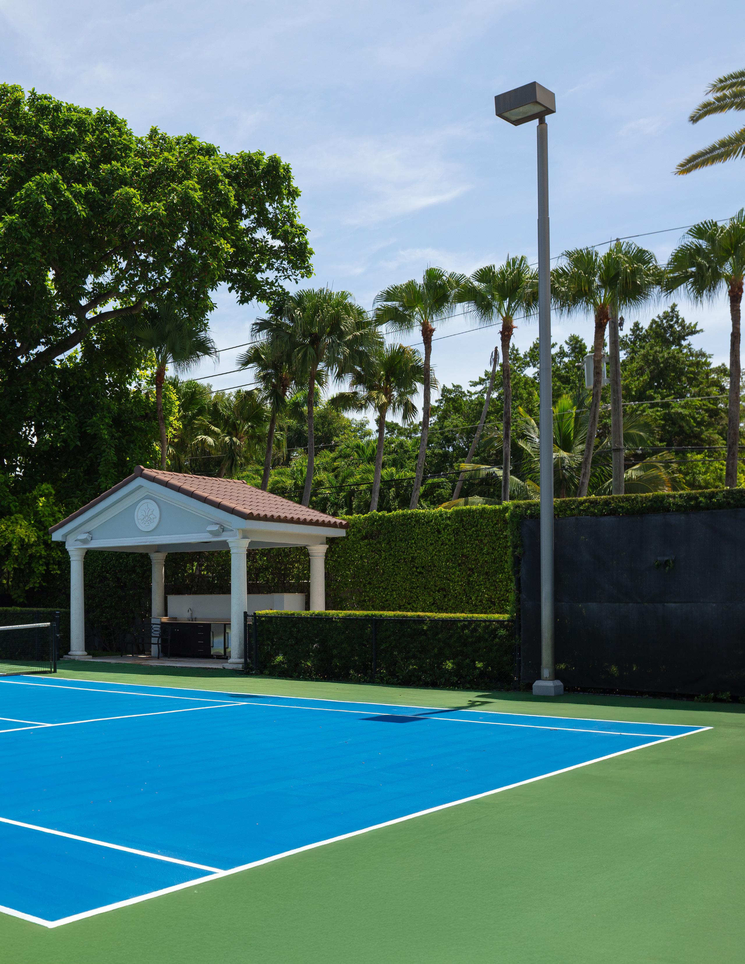 A regulation-size all-weather tennis court with viewing pavilion is located at the front of the estate, rounding out its extensive grounds.