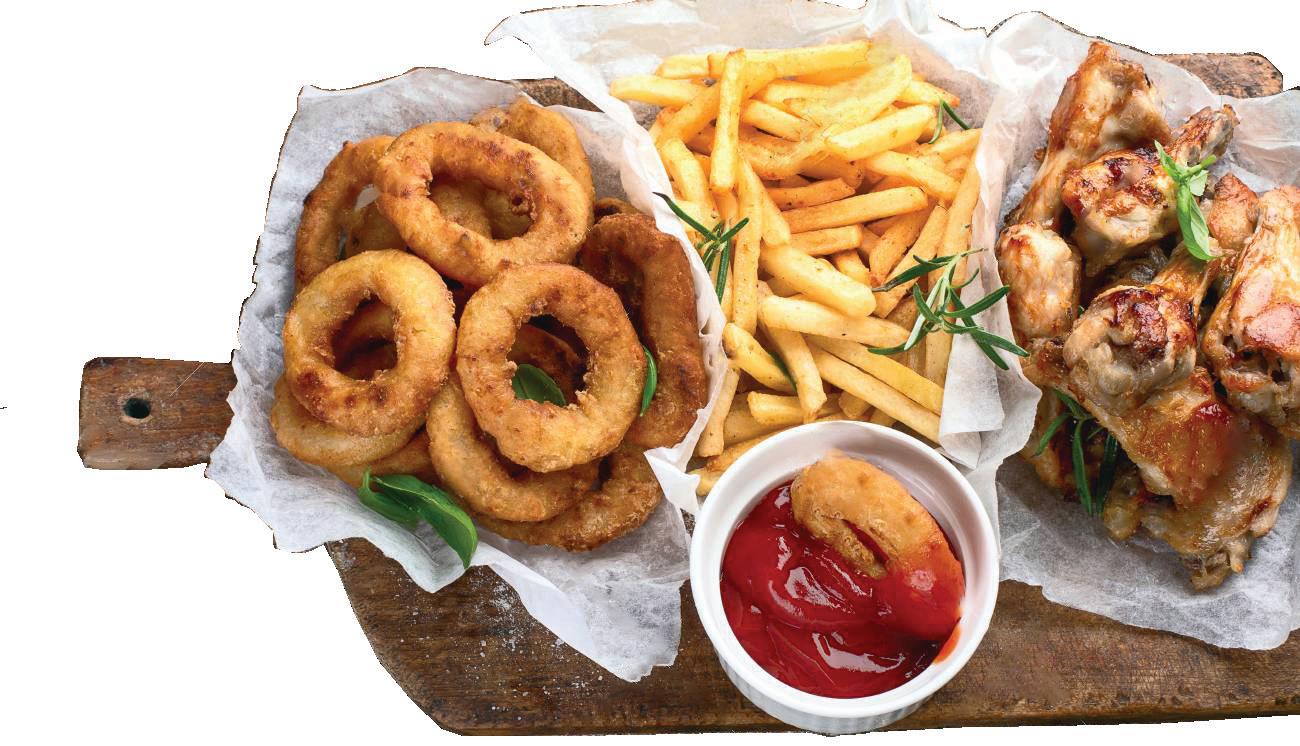 Aros de cebolla, alitas, capita empanizado, papas fritas preparadas, tortillas, frijoles y chorizo