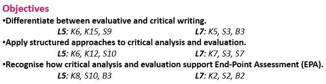 •Recognise how critical analysis and evaluation support End-Point Assessment (EPA).
