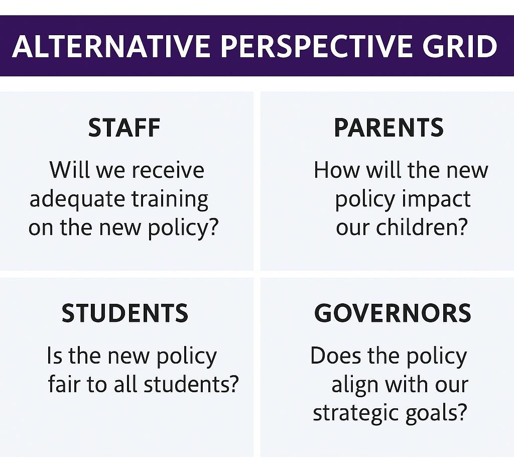 An alternative perspectives grid encourages critical analysis by helping you consider a decision or issue through multiple stakeholder viewpoints. It highlights different priorities and concerns, strengthening the depth, balance and insight of evaluations and written analysis.