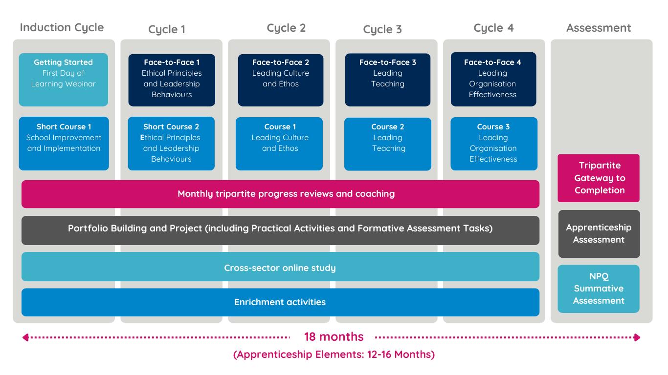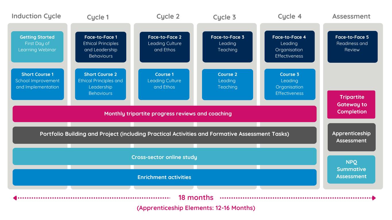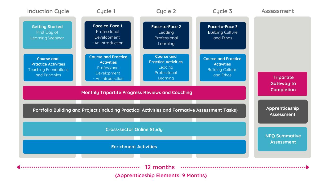 All Leader Apprenticeships with NPQ programmes feature cyclical structure with ongoing support elements. They all employ a blended delivery model, balancing synchronous activities (face-to-face events, coaching, and monthly progress reviews) with asynchronous components (practice activities, some monthly progress reviews, offline check-ins, formative assessment tasks, and online modules). This approach allows you to